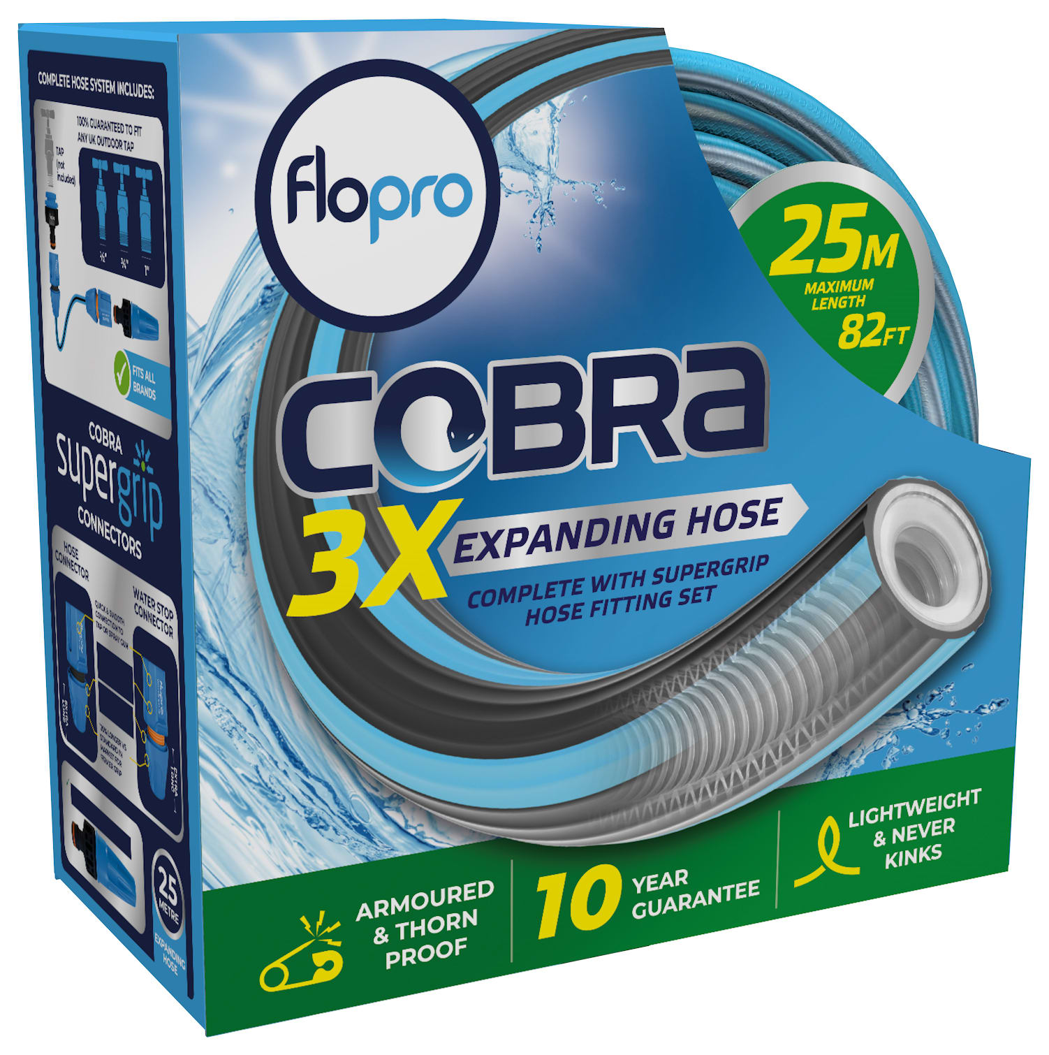 Experience the strongest expanding hose available – the Flopro Cobra Expanding Hose. It’s 50% lighter than a traditional hosepipe so you can easily use it around the garden. However, it’s also extremely tough so you can water with freedom. Unlike fabric expanding hoses, Cobra is armoured and thorn proof to ensure no garden obstacles can get in the way of your watering. Different from some traditional hoses, that can easily become tangled, Flopro Cobra Expanding Hose ensures no twists or kinks to give you an uninterrupted smooth flow of water. Simply attach to your outside tap, turn the tap on and watch the hose expand to 3 times its length. When you’ve finished watering, turn the tap off and watch it shrink back to its starting size. This makes Cobra extremely convenient to store.