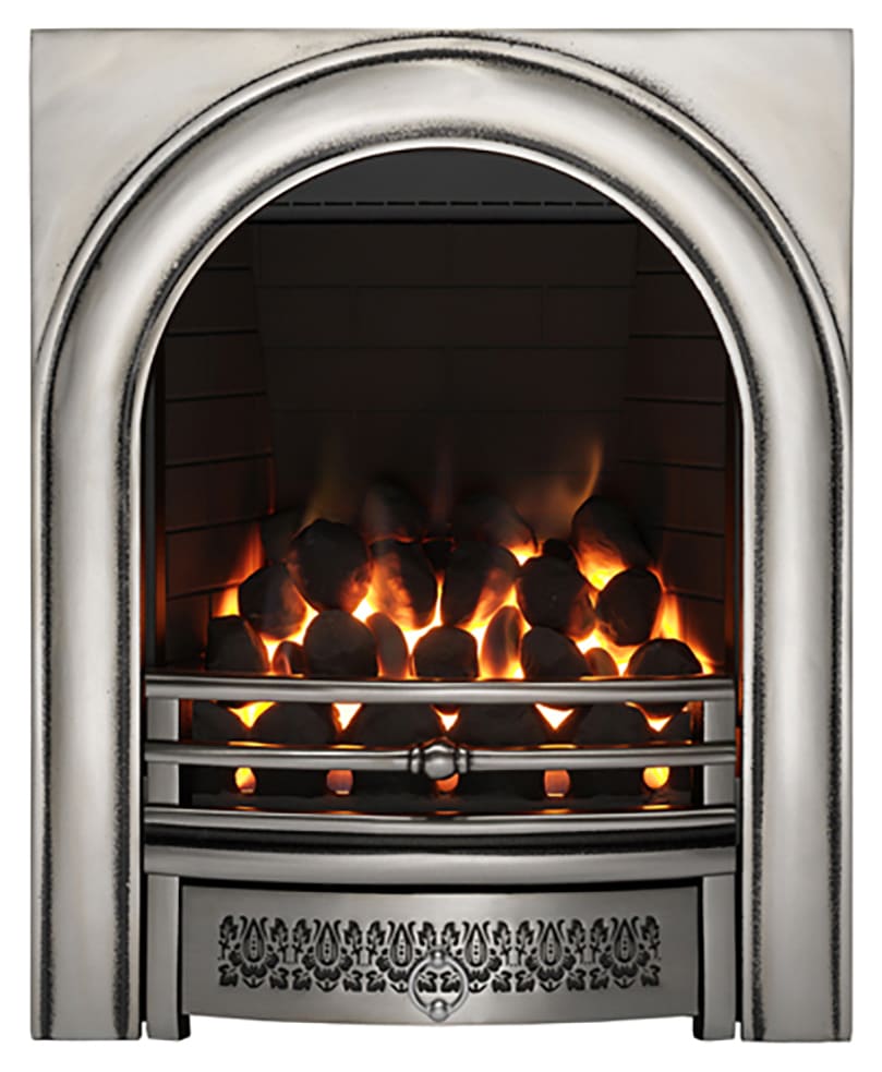The Focal Point Arch Chrome Full Depth Gas Fire features an open fronted design which perfectly mimics the look of an authentic traditional fire. Create a warm and inviting atmosphere with its easy to operate system. Suitable for most chimneys and flues, this versatile full depth gas fire utilises an easy to use rotary manual control. The distinct arch solid cast iron frame emulates the grand cast iron inserts used in larger period fireplaces.