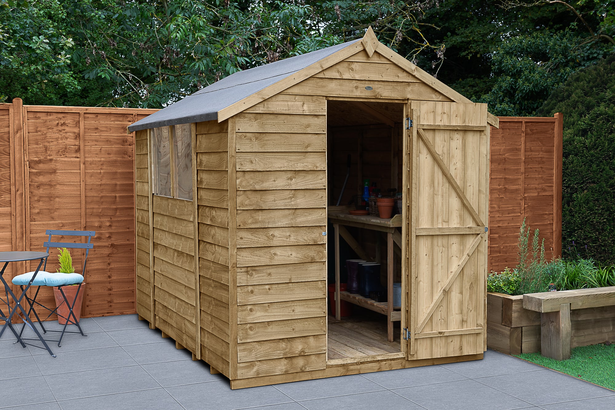 The Forest 4Life Overlap Pressure Treated 8 x 6ft Apex Shed with windows is an excellent storage solution. The reverse apex roof makes it ideal for positioning against a wall and allows the interior space to be used to its greatest storage potential. This wooden shed comes with an improved design, featuring modular panels. This means it’s delivered in smaller sections but you get more wood, making for an easier assembly, more versatile configuration and a much stronger shed. All in all, the Forest 4Life range of sheds are the best overlap sheds we've ever made. Supported by 30%-thicker framing than found on most wooden sheds, this shed is constructed using straight-cut 7mm boards that overlap to give flexibility, allowing natural movement of the timber during the changing seasons and aiding rain water run-off. The pressure treatment that has been applied gives this shed a 25 year anti-rot guarantee, giving you maintenance freedom, preservative treatment is not required. Rather than the more common OSB (oriented strand board), this garden shed features an extra-thick 14mm solid timber floor, allowing for the storage of heavier items. The roof of this apex shed is made from hard wearing 8mm solid sheet, finished with a green sand-felt cover for complete weatherproof protection. This shed’s door features a double-Z frame, for increased strength and to prevent door movement Security is enhanced with hidden hinges and a padlock-ready simple and secure hasp and staple latch to keep valuable items safe (padlock not included). What’s more, the door can be fitted with a left or right-hand opening. The Shed has shatter-proof PET glazing which is more secure than traditional glass and does not yellow or fade over time. With its traditional apex roof, smooth-planed barge boards and diamond-shaped finial, this wooden shed will look good in any garden. Handcrafted in the UK using responsibly sourced timber, this garden shed comes with a full set of fixings and clear instructions to help you achieve a straightforward assembly. This shed is delivered free to most UK addresses, using Forest Garden's white glove delivery service, so will be dropped off wherever you want it in your garden, with all packaging removed. This shed comes with a 8 x 6ft base.