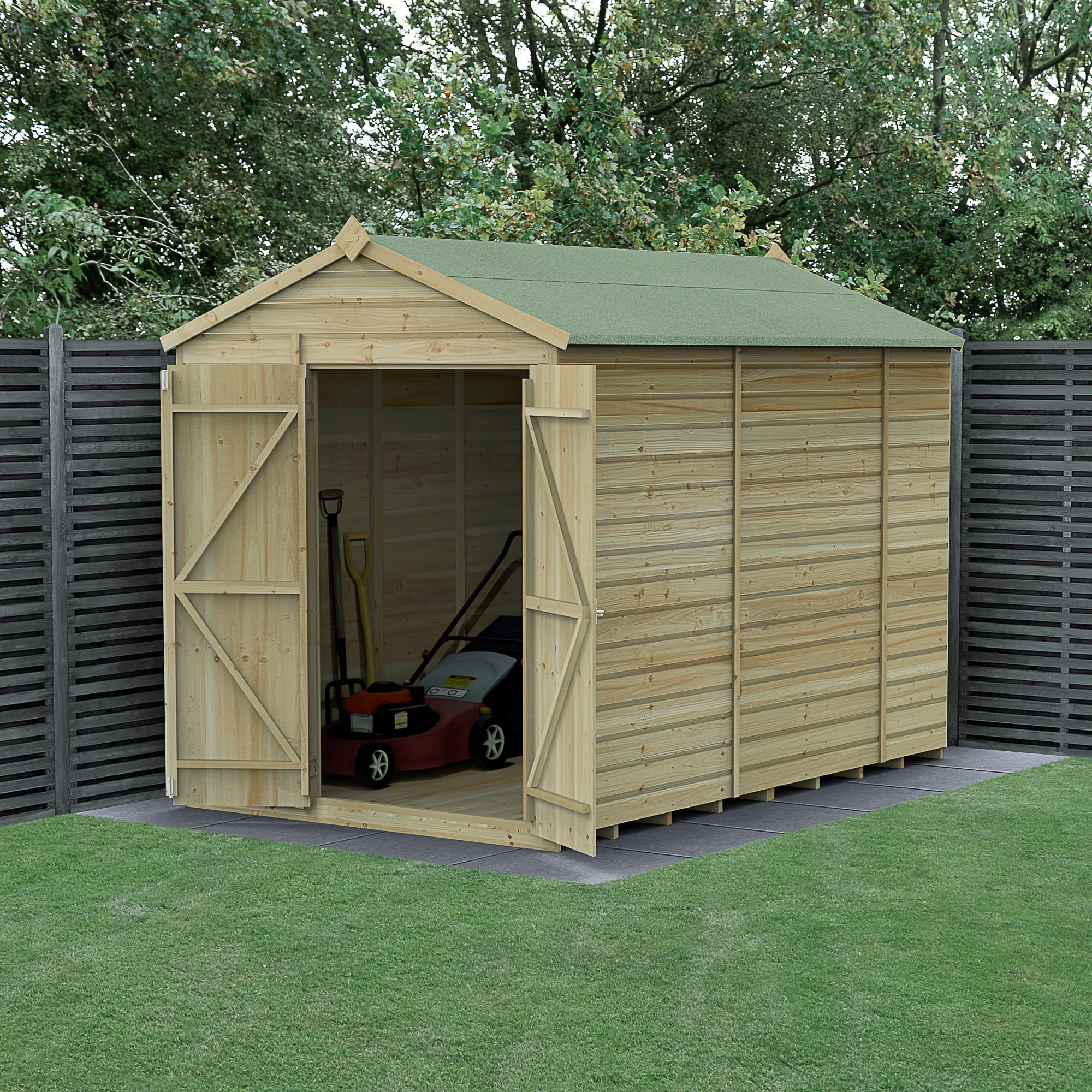 The Beckwood Shiplap Pressure Treated 6 x 10ft Apex Shed with No Windows and Double Door with Base from Forest has a traditional and sturdy design and is built in Britain for Britain. Built to withstand the elements, the shed can store anything from a simple spade to bikes, fishing equipment or outward bound gear! The shed's improved modular design features smaller sections, same size panels are interchangeable. The shed is made using robust, interlocking, weather-beating pressure treated shiplap cladding throughout, giving it a watertight seal. Supported by 30%-thicker framing than found on most wooden sheds, this shed is constructed to last. The pressure treatment that has been applied gives this shed a 25 year anti-rot guarantee, giving you complete maintenance freedom, annual preservative treatment is not required. Most other sheds require treatment once built then yearly thereafter. Rather than the more common OSB (oriented strand board), this shed features an extra-thick interlocking tongue and groove floor allowing for the storage of heavier items. The roof of this apex shed is made from hard wearing 8mm solid sheet, finished with a durable, high quality green felt cover for complete weatherproof protection. This shed’s door features a double-Z frame, giving strength and to prevent door movement. Security is enhanced with hidden hinges and a heavy duty, traditional pad bolt to keep valuable items safe (padlock not included). With its traditional apex roof, this wooden shed will look good in any garden. Handcrafted in the UK using FSC® certified timber, this garden shed comes with a full set of fixings and clear instructions to help you achieve a straightforward assembly. This shed is delivered free to most UK addresses, using Forest Garden's white glove delivery service, so will be dropped off wherever you want it in your garden, with all packaging removed. This shed comes with a 6 x 10ft base.