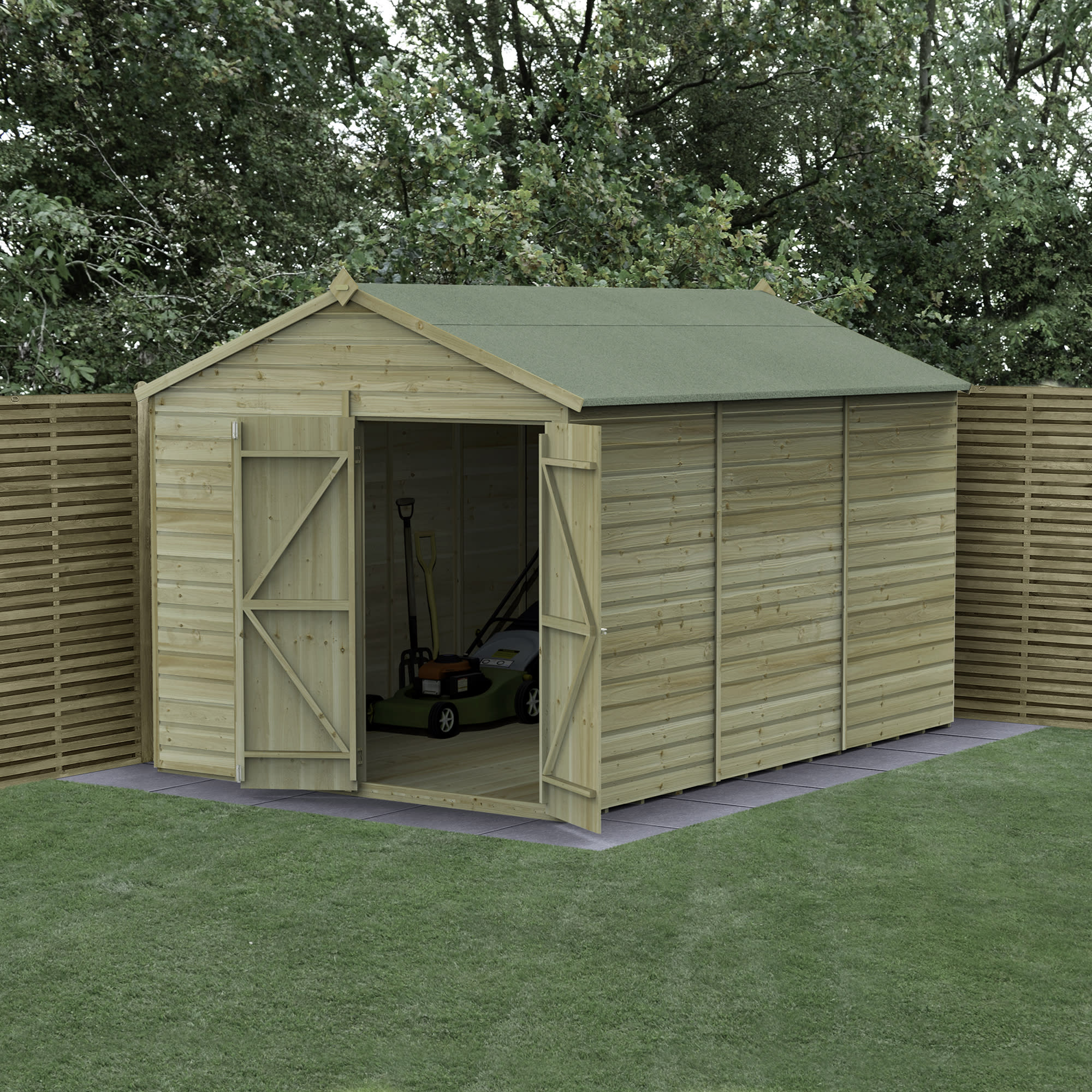 The Beckwood Shiplap Pressure Treated 8 x 12ft Apex Shed with No Windows and Double Door with Base from Forest has a traditional and sturdy design and is built in Britain for Britain. Built to withstand the elements, the shed can store anything from a simple spade to bikes, fishing equipment or outward bound gear! The shed's improved modular design features smaller sections, same size panels are interchangeable. The shed is made using robust, interlocking, weather-beating pressure treated shiplap cladding throughout, giving it a watertight seal. Supported by 30%-thicker framing than found on most wooden sheds, this shed is constructed to last. The pressure treatment that has been applied gives this shed a 25 year anti-rot guarantee, giving you complete maintenance freedom, annual preservative treatment is not required. Most other sheds require treatment once built then yearly thereafter. Rather than the more common OSB (oriented strand board), this shed features an extra-thick interlocking tongue and groove floor allowing for the storage of heavier items. The roof of this apex shed is made from hard wearing 8mm solid sheet, finished with a durable, high quality green felt cover for complete weatherproof protection. This shed’s door features a double-Z frame, giving strength and to prevent door movement. Security is enhanced with hidden hinges and a heavy duty, traditional pad bolt to keep valuable items safe (padlock not included). With its traditional apex roof, this wooden shed will look good in any garden. Handcrafted in the UK using FSC® certified timber, this garden shed comes with a full set of fixings and clear instructions to help you achieve a straightforward assembly. This shed is delivered free to most UK addresses, using Forest Garden's white glove delivery service, so will be dropped off wherever you want it in your garden, with all packaging removed. This shed comes with a 8 x 12ft base.