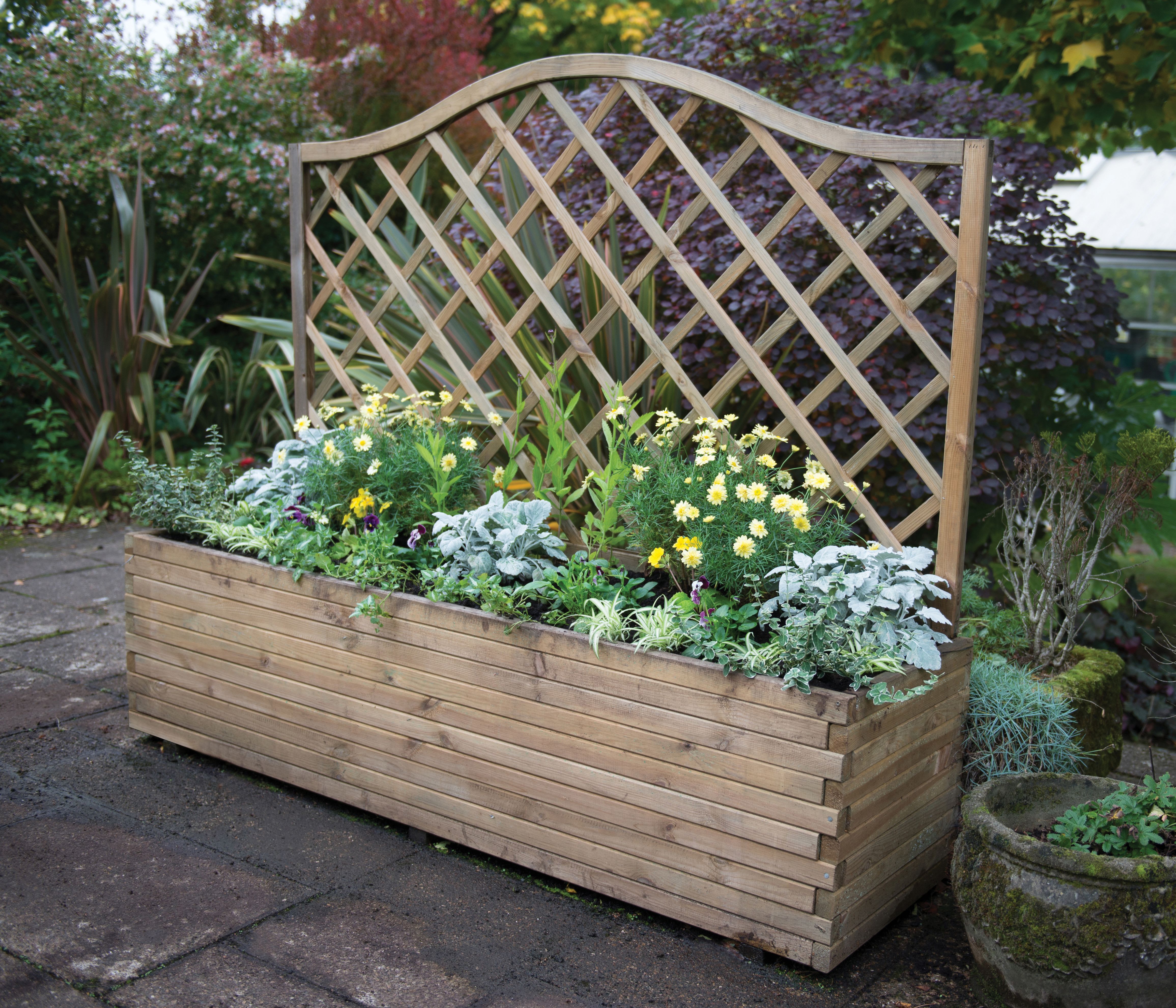 The Venice Natural Planter from Forest Garden has a beautiful integrated dome top diamond trellis that is not only aesthetically pleasing but will support the growth of climbing plants. All timber used to manufacture this product has been pressure treated to give it a guarantee against rot and fungal decay for 15 years. The trough can hold 300L of compost, so there is plenty of room for a multitude of plants, flowers or even vegetables.
