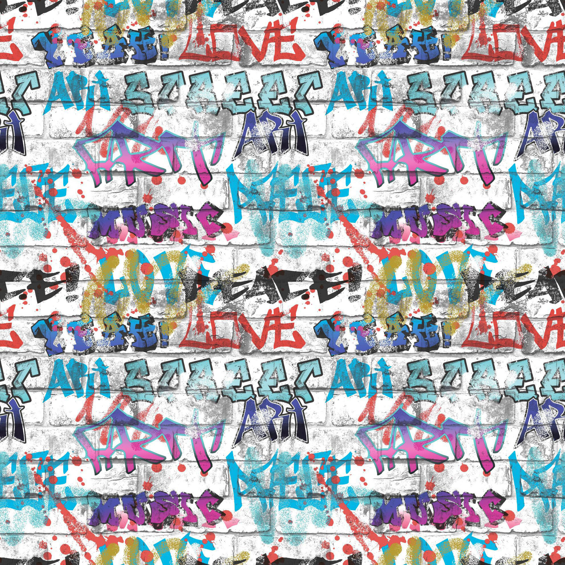 Create an urban street room with this cool graffiti wallpaper. Featured on a black brick with popping colours, use this wallpaper as a feature or on multiple walls to create a very cool hangout.