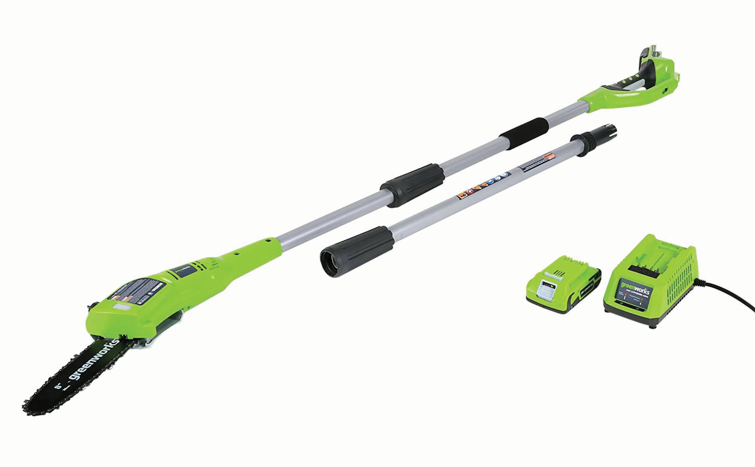 The Greenworks Cordless Pole Saw is a lightweight 24V pole saw kit designed for pruning high branches, at 2.4m in length the machine can easily cut branches up to 3m high without compromising on safety. Powered by an advanced 24V lithium-ion battery, the pole saw offers high performance despite its compact size. Convenience is guaranteed with no fuel or electric cables to contend with, simply insert the battery and cut.