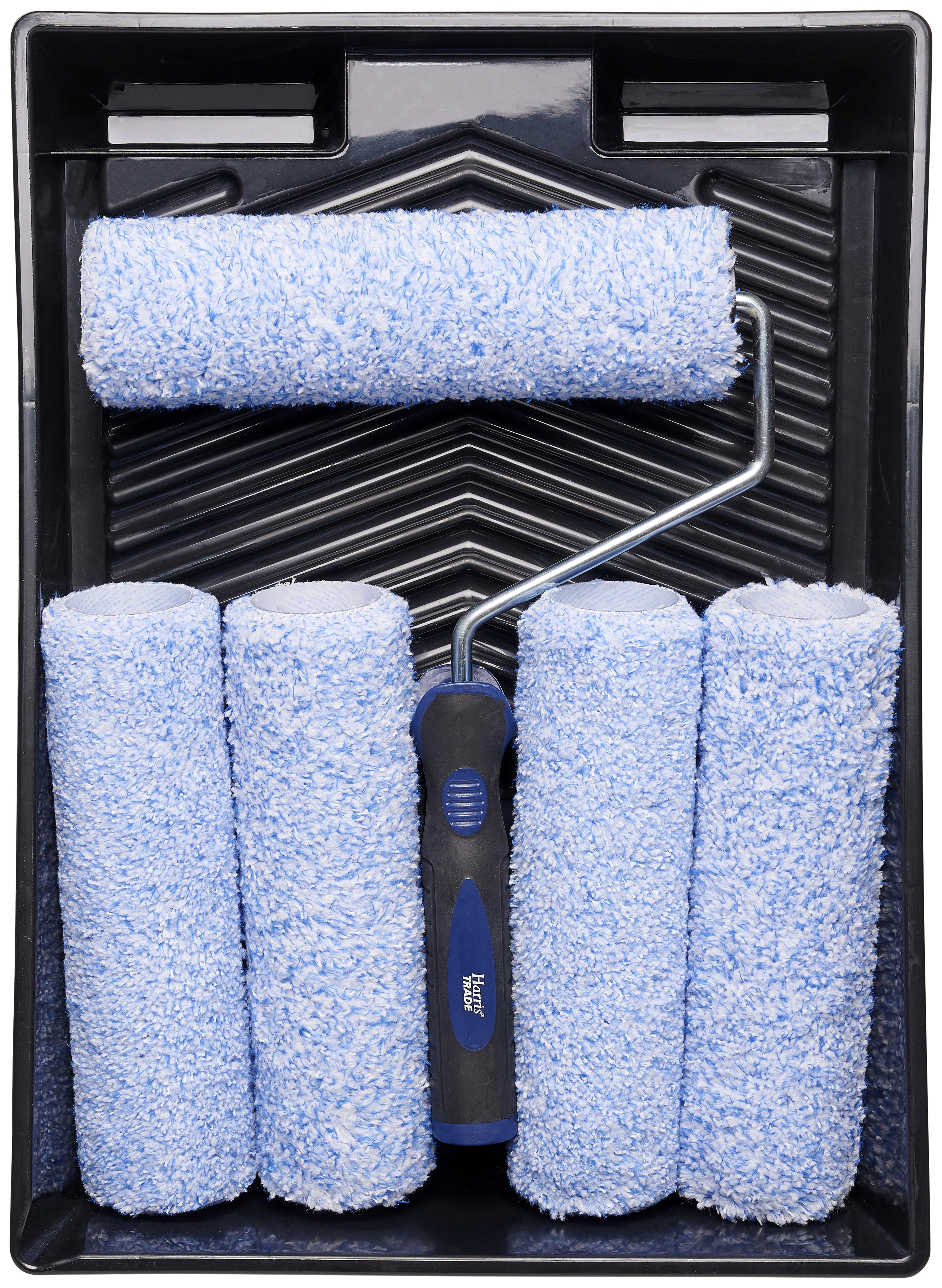Harris Trade 7-piece 9” medium pile roller set gives a great finish with interior paints on smooth and semi-smooth surfaces, such as woodchip, previously painted, or lightly textured walls and ceilings. A 9” soft grip roller frame is compatible with screw-fit extension poles, and the 9” tray's deep construction means it can hold an additional 1.25 litres of paint over a regular tray.