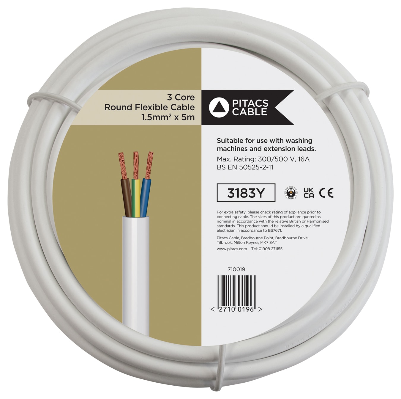 Heavy Duty 3 Core White Flexible Cable - 1.5mm2 x 5m
