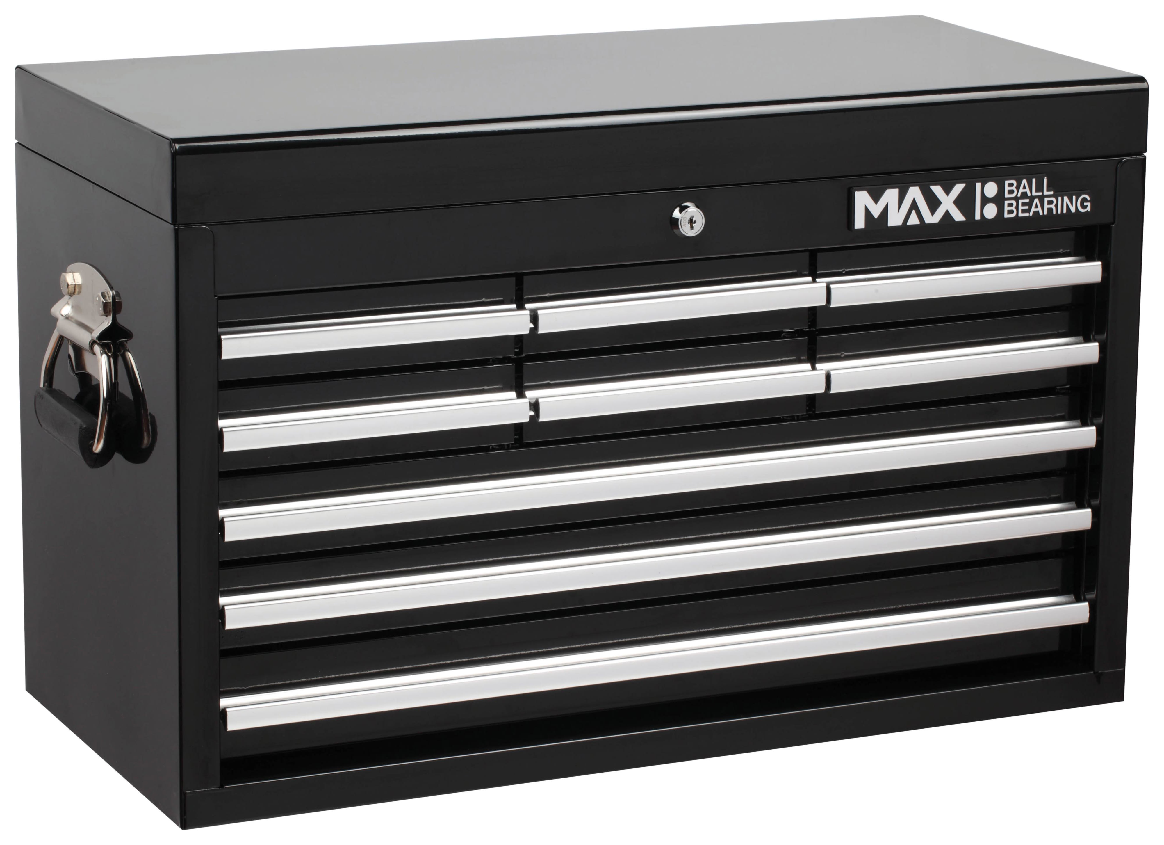 Heavy duty all steel construction with ball bearing slides with positive stop. Comes with drawer liners keyed locking mechanism full length aluminium drawer pulls and chrome side handles. Tote tray in top compartment.