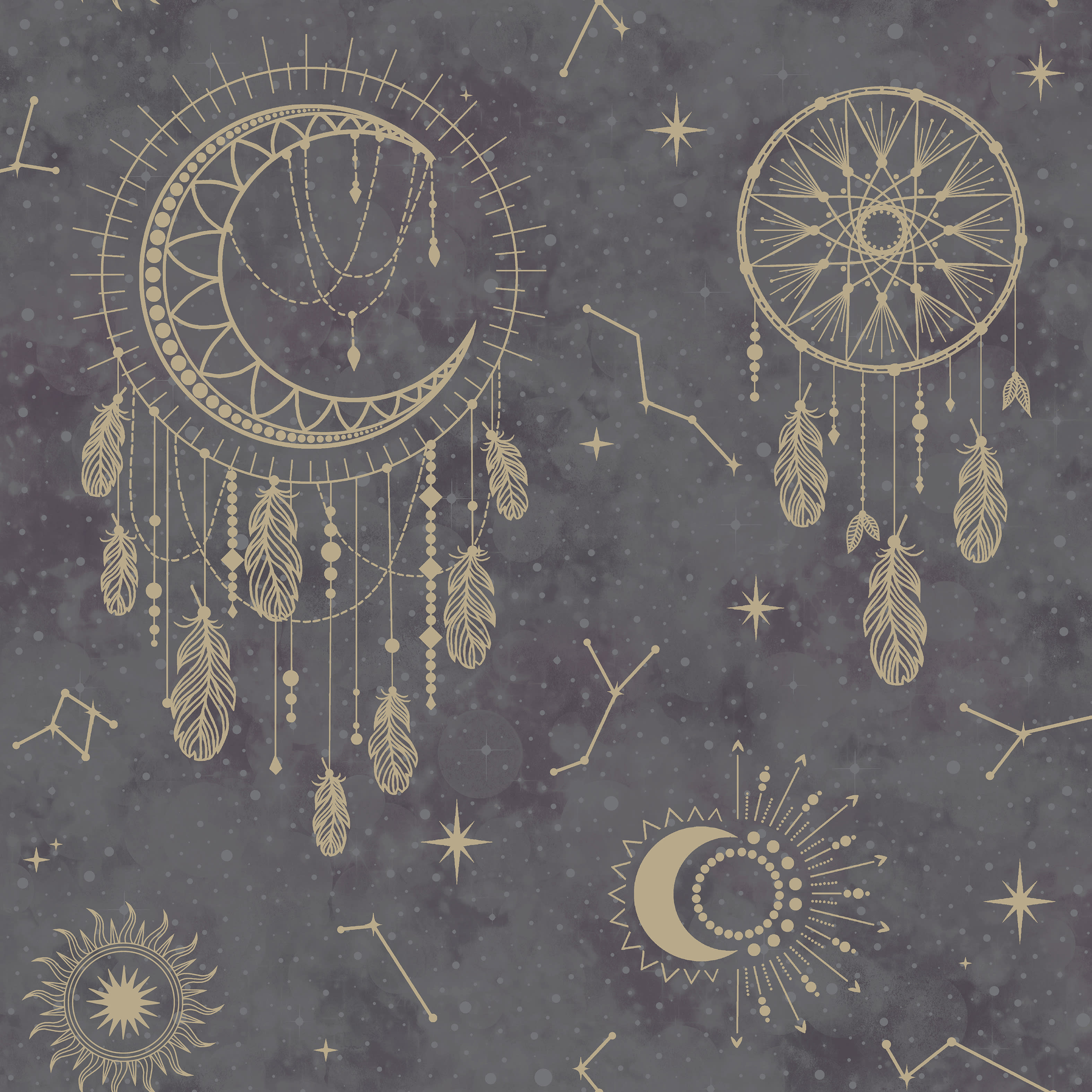 The Dreamcatcher Wallpaper from Holden Decor features a series of detailed metallic dreamcatchers, suns, stars, moons and star signs sat on a watercolourd effect background. This design also features metallics throughout.