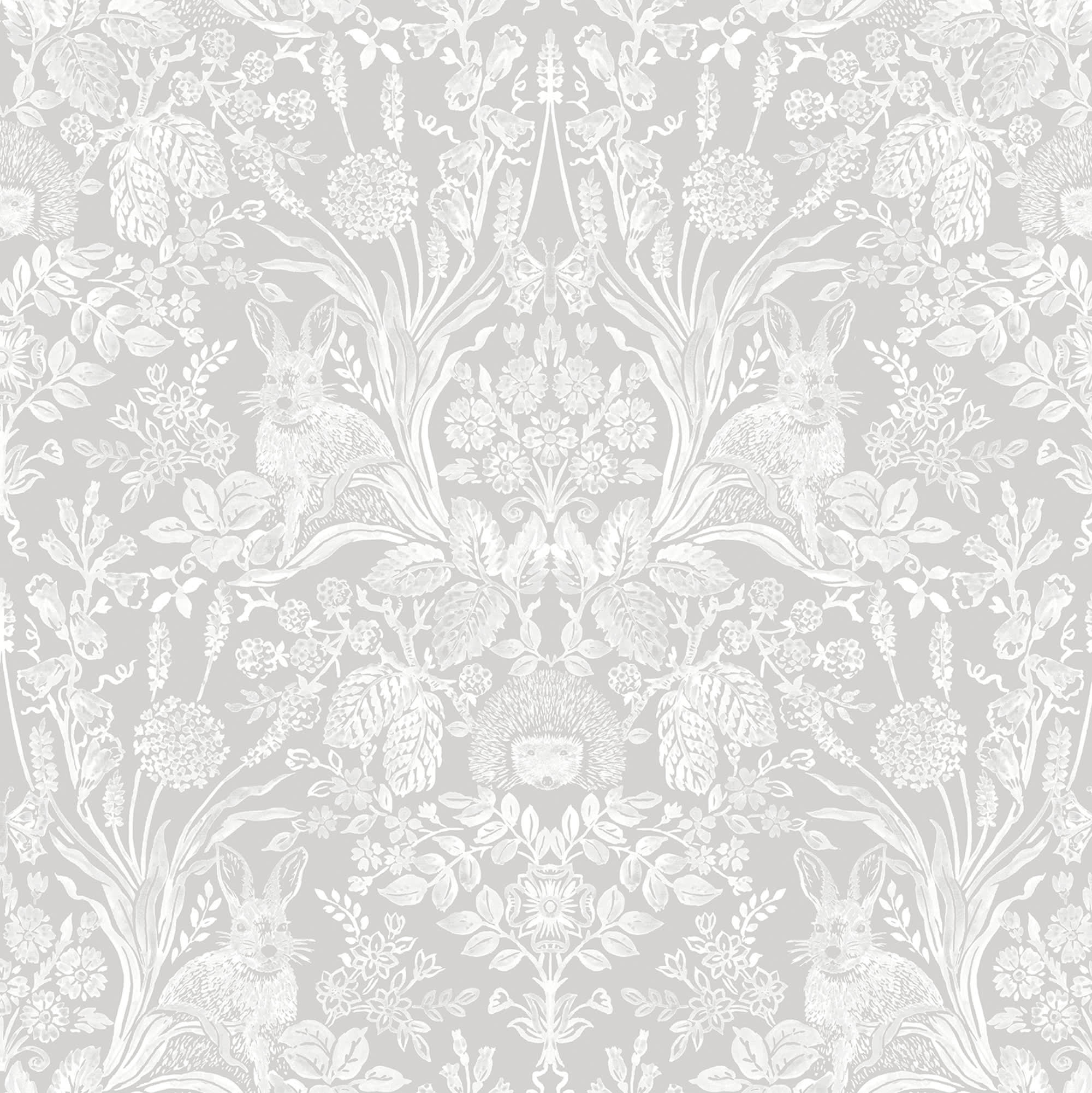 The Harlen Wallpaper from Holden Decor is a beautiful woodland animal design with delicate wild flowers, hedgehogs, rabbits and butterflies in a hand printed vintage style on a grey background.