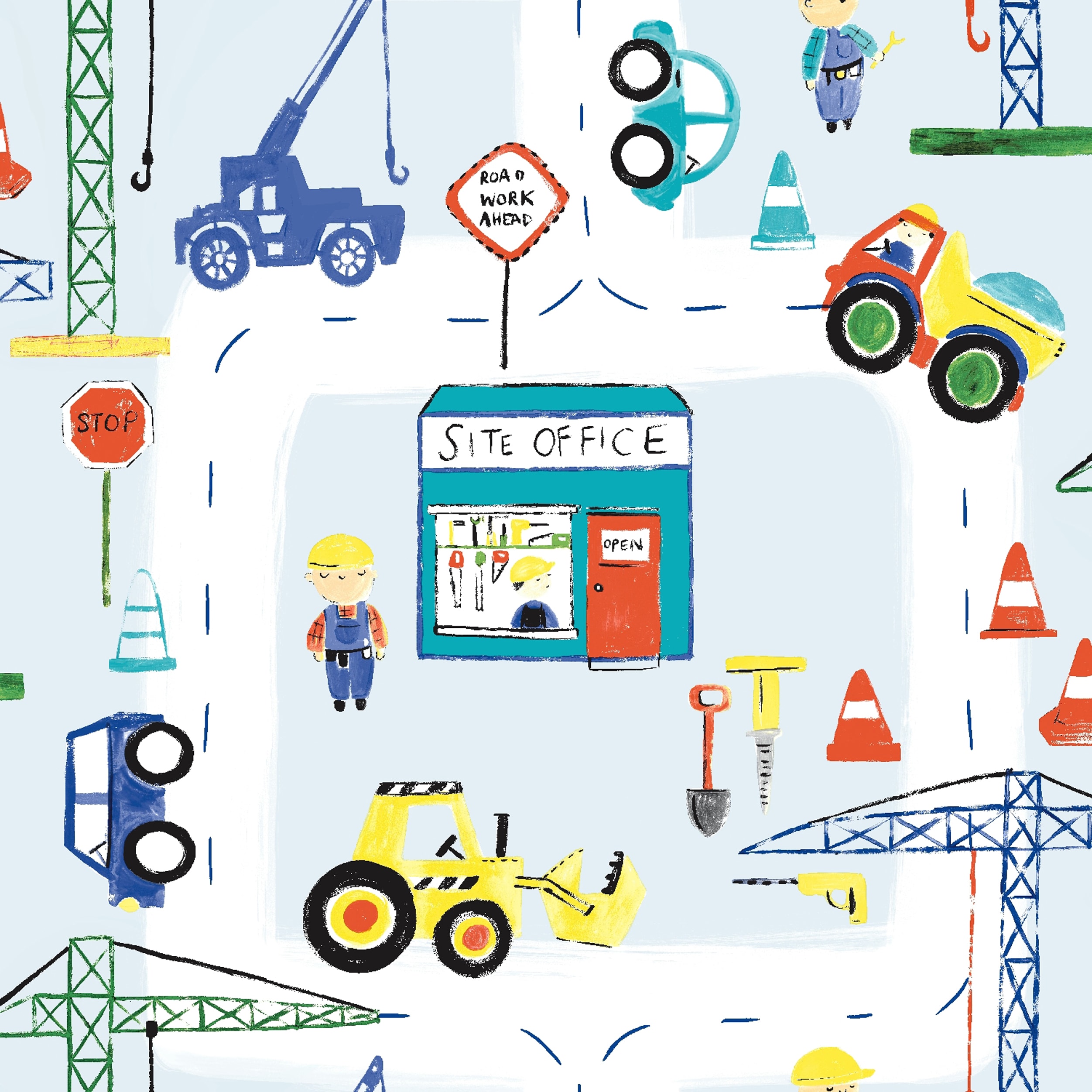 The Road Work Ahead Wallaper from Holden Decor features diggers, trucks, cars and cranes in this construction themed wallpaper. Brightly coloured vehicles on a pale blue background.