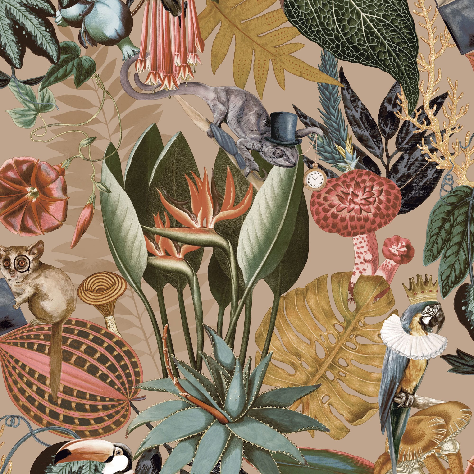 The Wonderland Wallpaper from Holden Decor is a quirky and fun tropical design. It features parrots wearing a crown, chameleons with a top hat and bush babies wearing a monocle! All are set within bold tropical leaves with a ochre matt background.