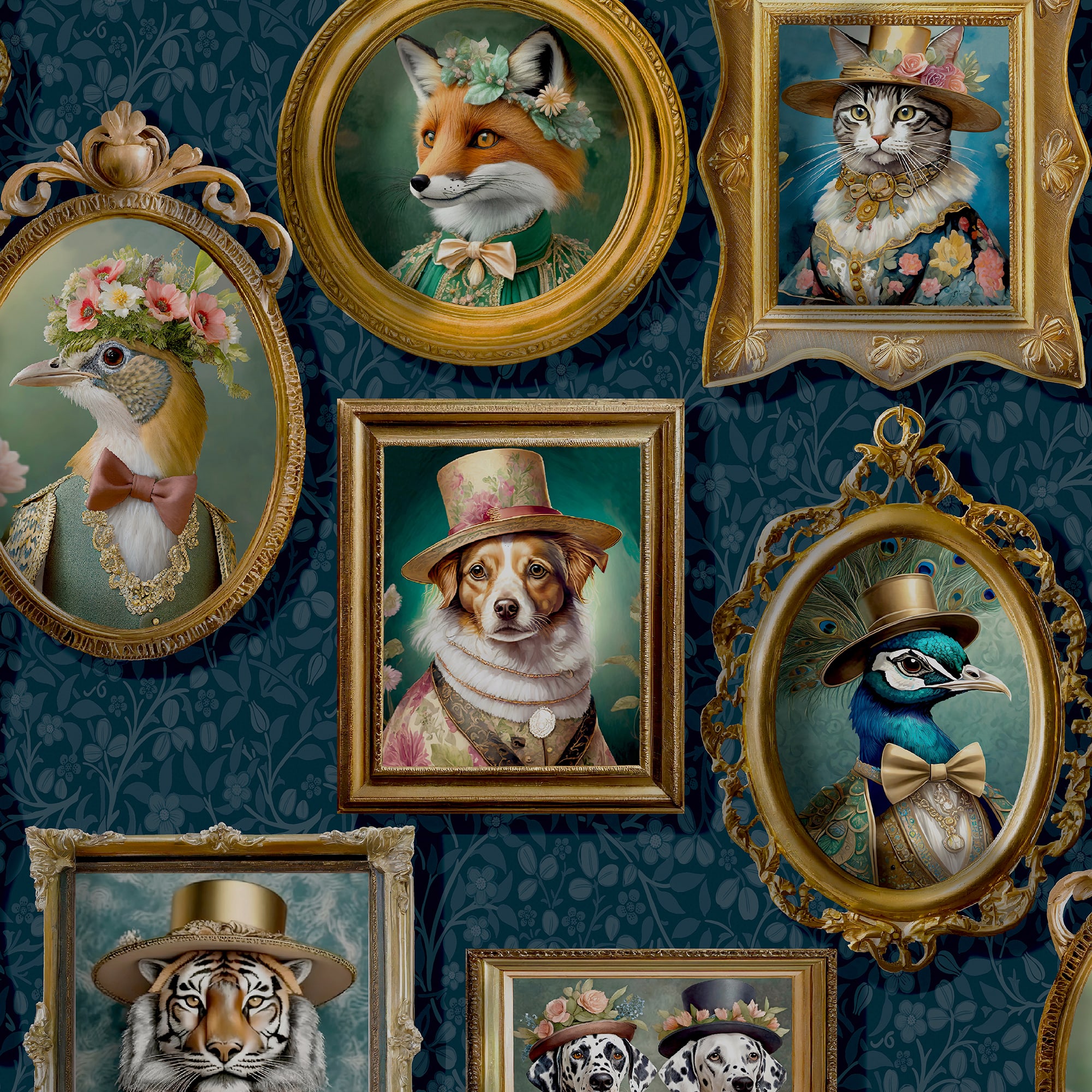 This Regal Beasts Navy Wallpaper features an array of elegant picture frames, each showcasing charming animals dressed in exquisite Victorian-era attire. From dapper doggies in top hats to graceful foxes in evening attire, each portrait exudes a whimsical blend of sophistication and fantasy. This is all set on a soft, painterly leaf trail background.