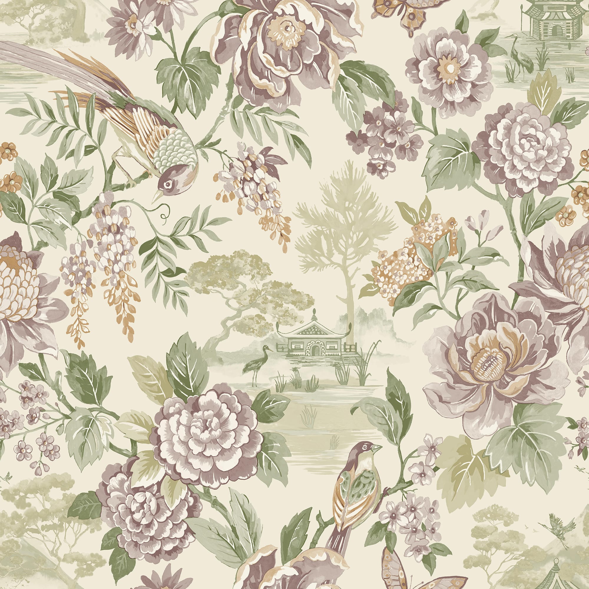 Scenic Bird Trail Green & Cream Wallpaper is a harmonious blend of nature and tradition, with large blossoming flowers and playful birds that draw you in to the serene scenes of Japanese pagodas, evoking a sense of timeless tranquillity. This classical design brings a sense of peace and beauty to any space, whilst also creating bold walls.