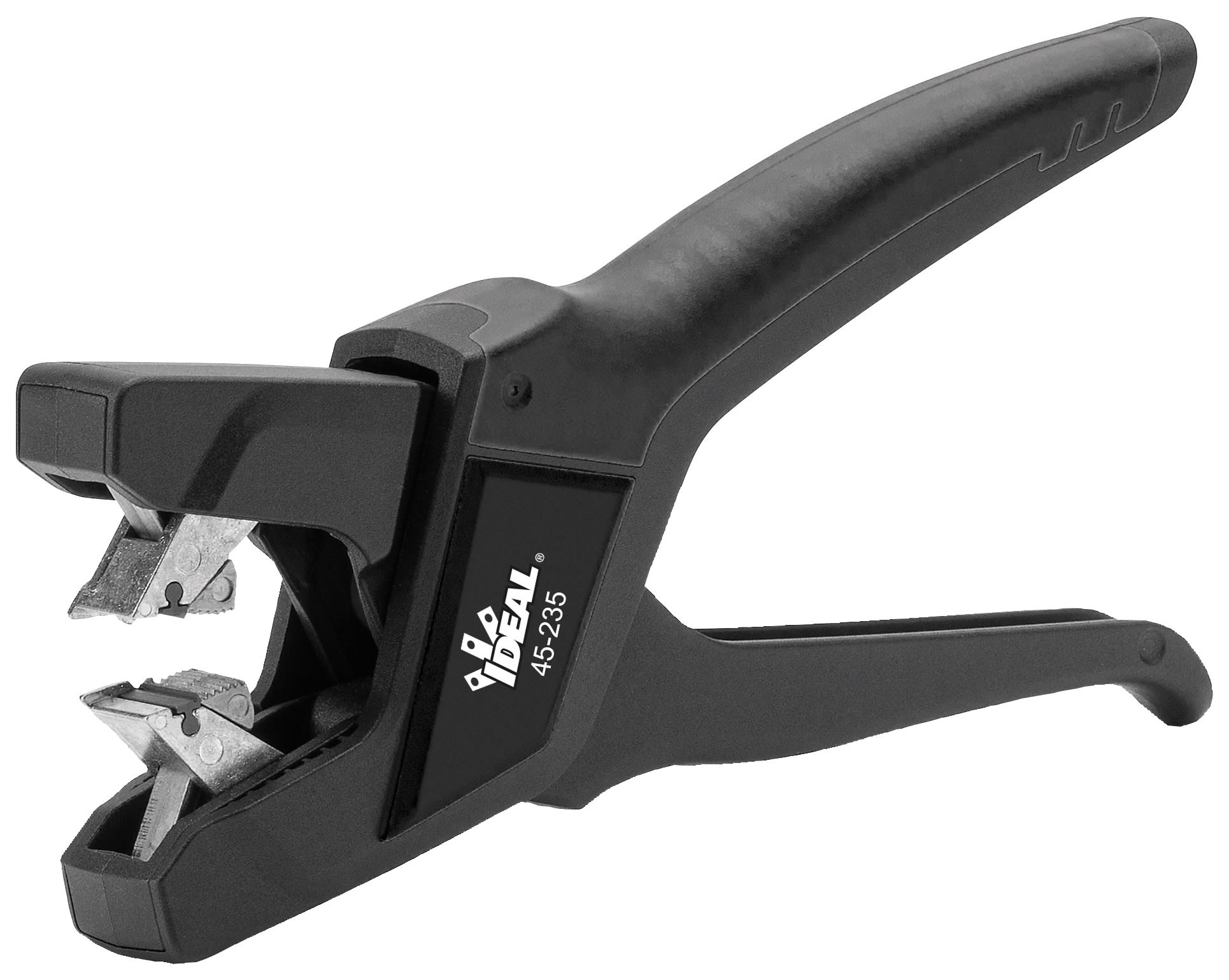 The IDEAL Industries 45-235 Flat Cable Stripper for Twin & Earth has an open-throat design which allows an unlimited strip length for both the outer sheath and the inner wire sheathing. Self-adjusting stripping blades automatically select proper position to remove the sheath without marking the cable.