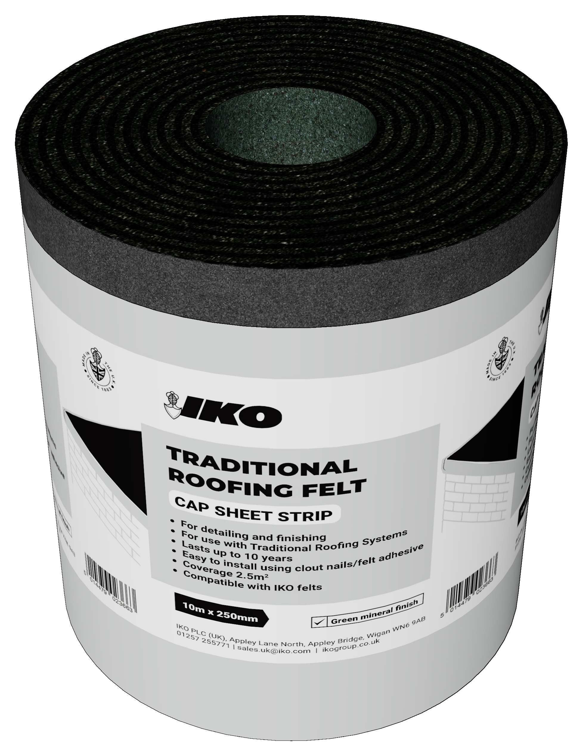 IKO Traditional Cap Sheet Strip is a green mineral finishing strip which is designed to be used with IKO Roofing Felt Topsheet, for detailing and finishing the roof on a range of common garden buildings.