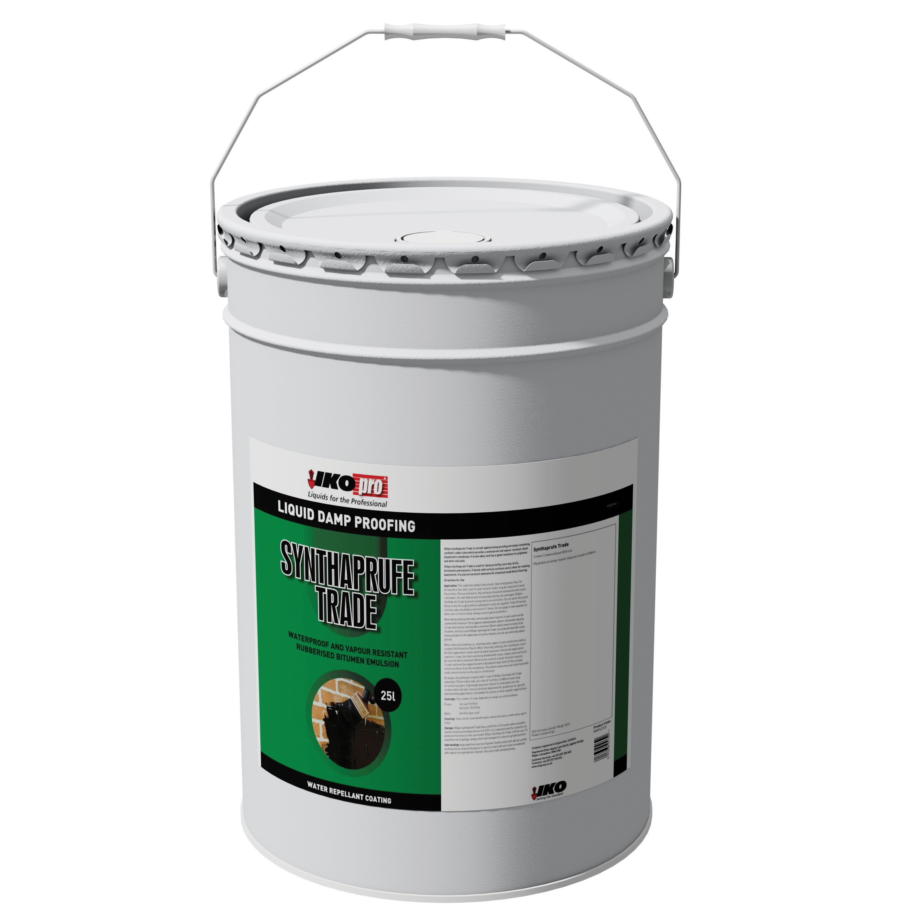 IKOpro Synthaprufe Trade is a blend of bitumen emulsion and synthetic rubber latex and can be used to damp proof a structure both below, at, or above ground level.