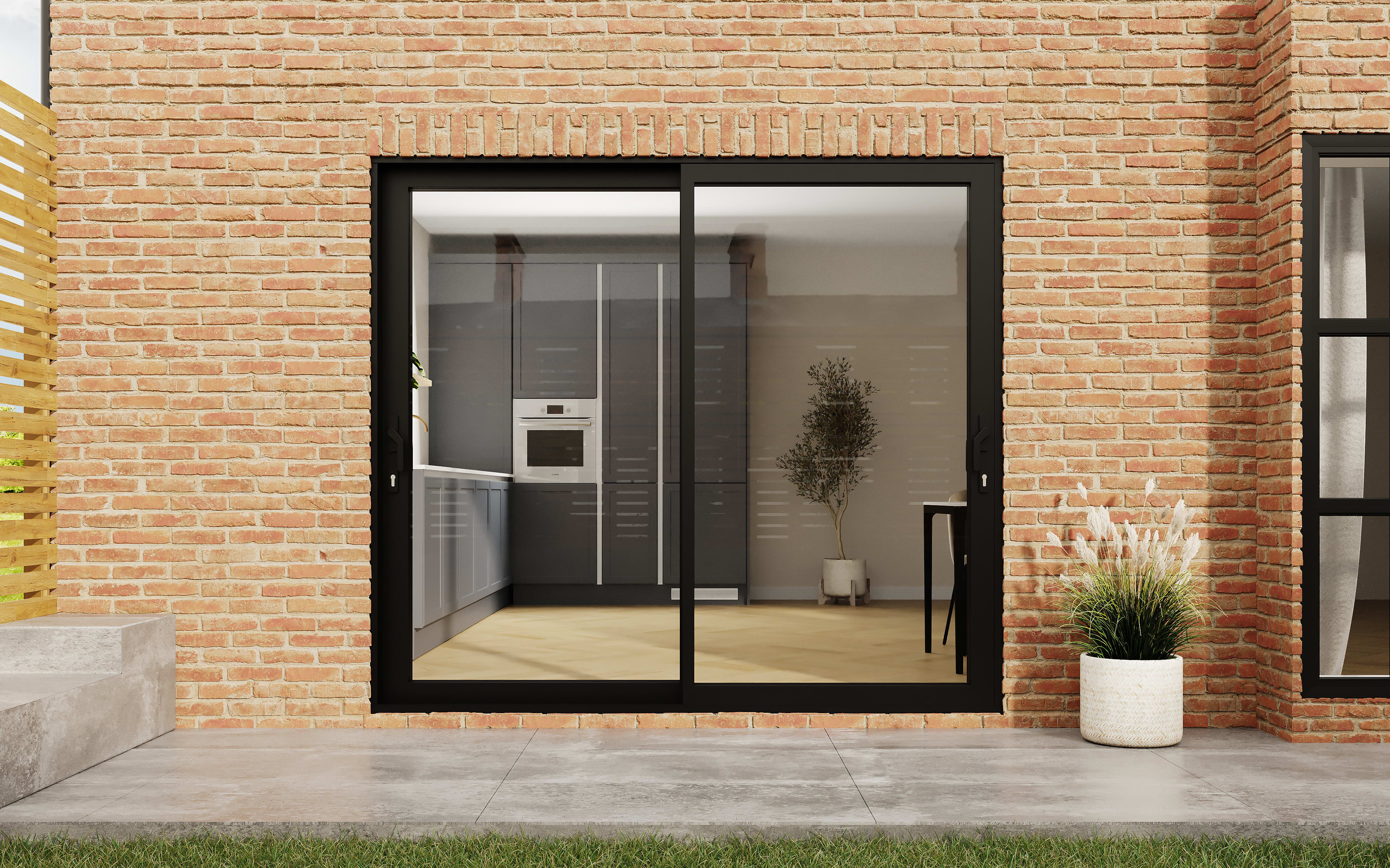 JCI Black Aluminium Inline Sliding Patio Door Set offers space saving versatility with both doors opening as standard. Featuring the slimmest 47mm sightlines for maximum light with uninterrupted views, the powder coated aluminium profiles are strong and durable, very low maintenance and lightweight for effortless operation.