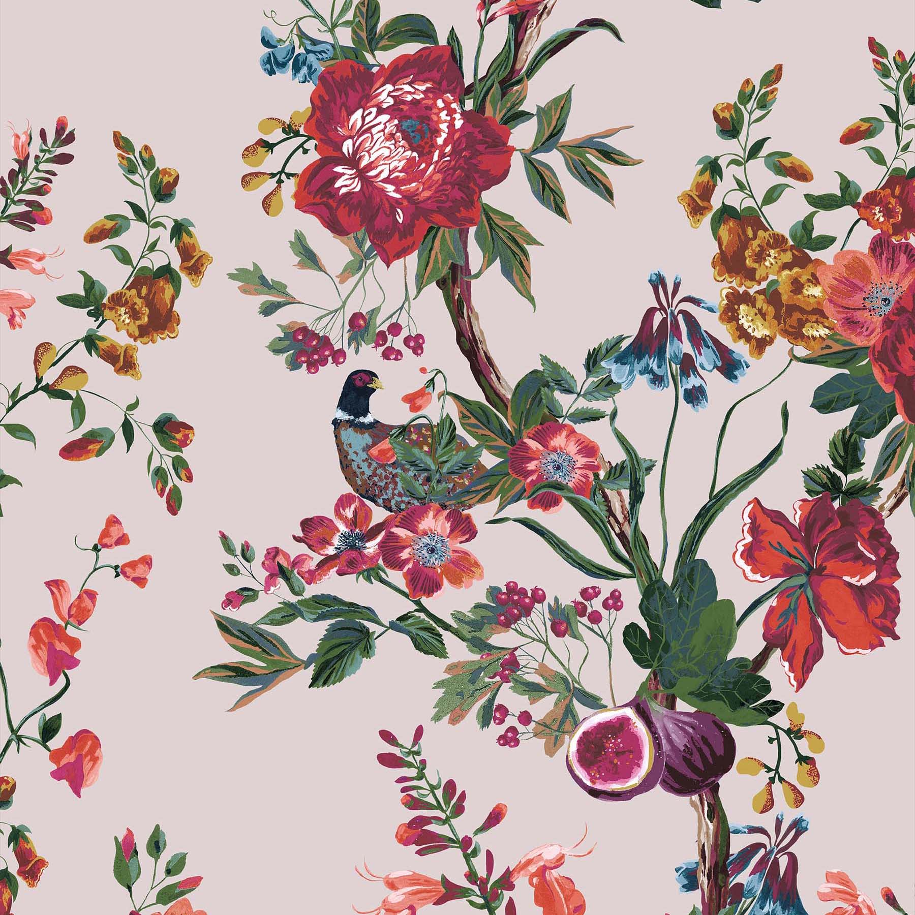 Bring the drama of the great British countryside to your home with this beautiful hand-painted chinoiserie, brimming with enchanting trailing blooms. Discover hidden pheasants, charming fruits and berries intertwined with florals, all painted with exquisite detail. The antique crème background has a warming pink undertone for softness, and bright pops of colour lift the design for a fresh take on a classic piece. Perfect paired with bright furnishings, it's sure to get heads turning. This beautiful design has a large repeat for impactful scale and is printed on a matt substrate for a contemporary look and feel. This wallpaper is also paste-the-wall, making it easy to hang.