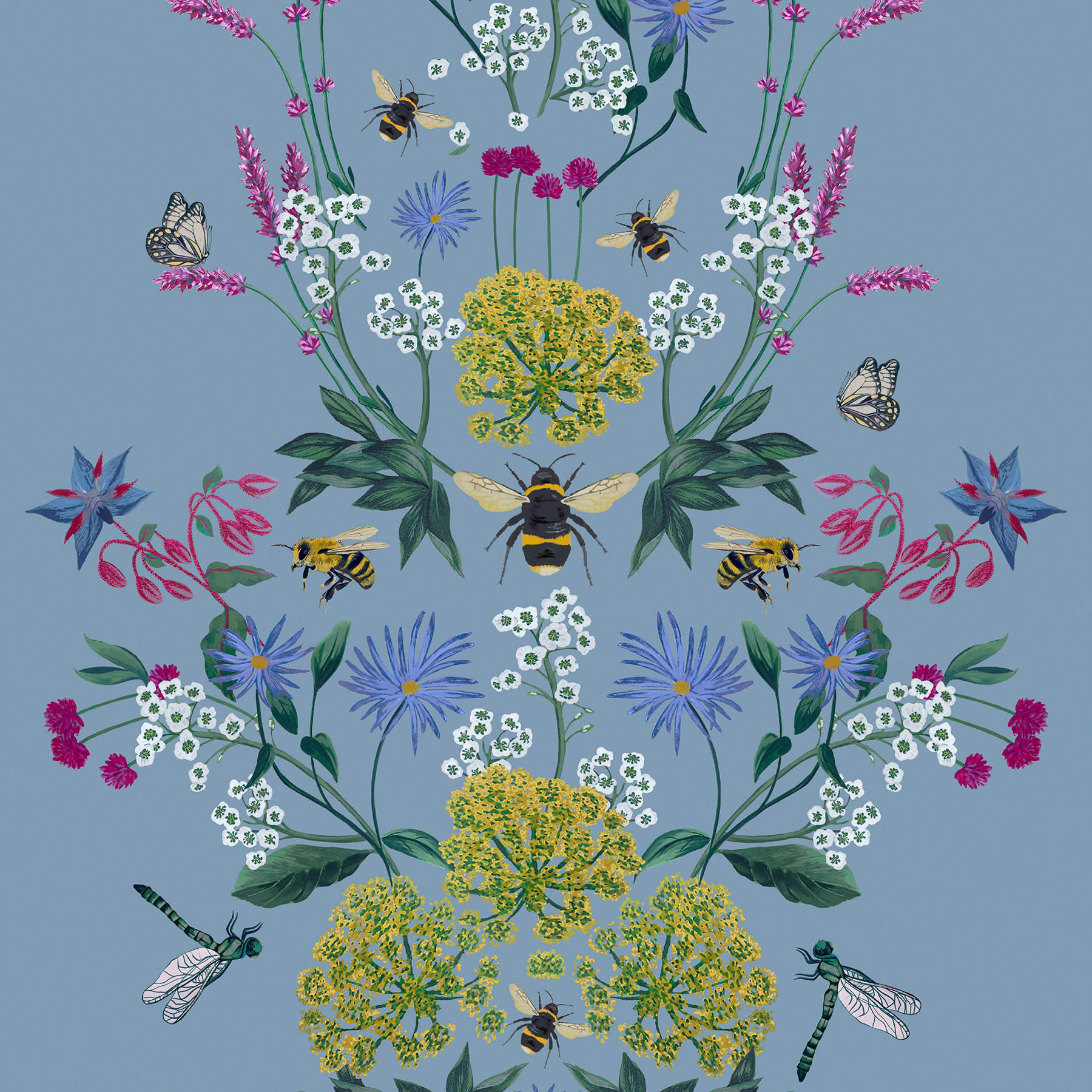 Turn your walls into a haven for bees! This striking floral wallpaper design is where nature takes centre stage. With beautiful floral sprigs and blooms surrounded by bees and butterflies, this design creates delicate undulating stripes along the wall. Beautiful bright tones of yellows, pinks and blues are perfectly sat upon a warming, haze blue background. Printed on a matt substrate for a contemporary look and feel. This wallpaper is also paste-the-wall, making it easy to hang.