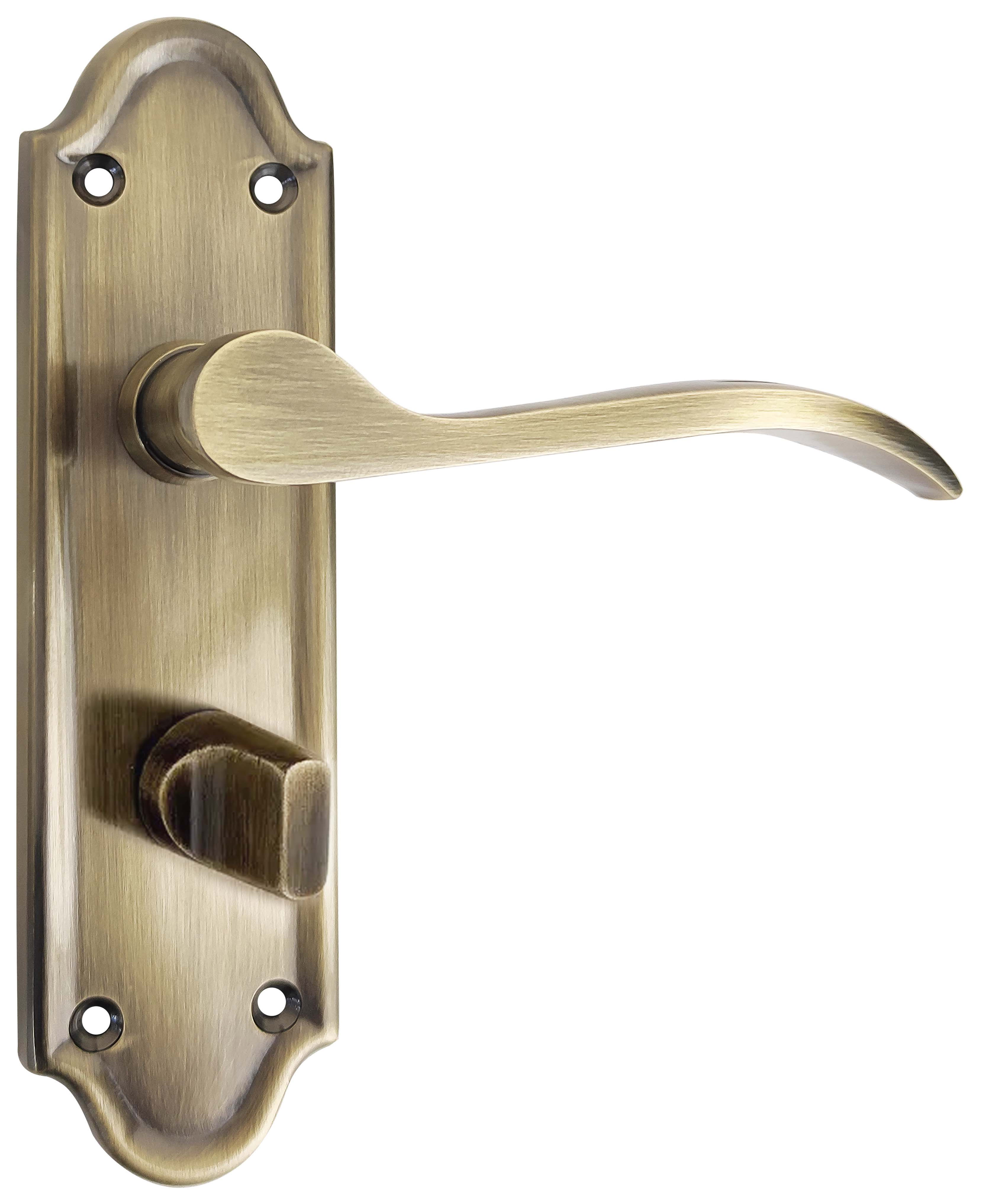 The Kennington Lever Lock Door Handle is on a backplate in trending antique brass finish is ideal for bathroom doors.