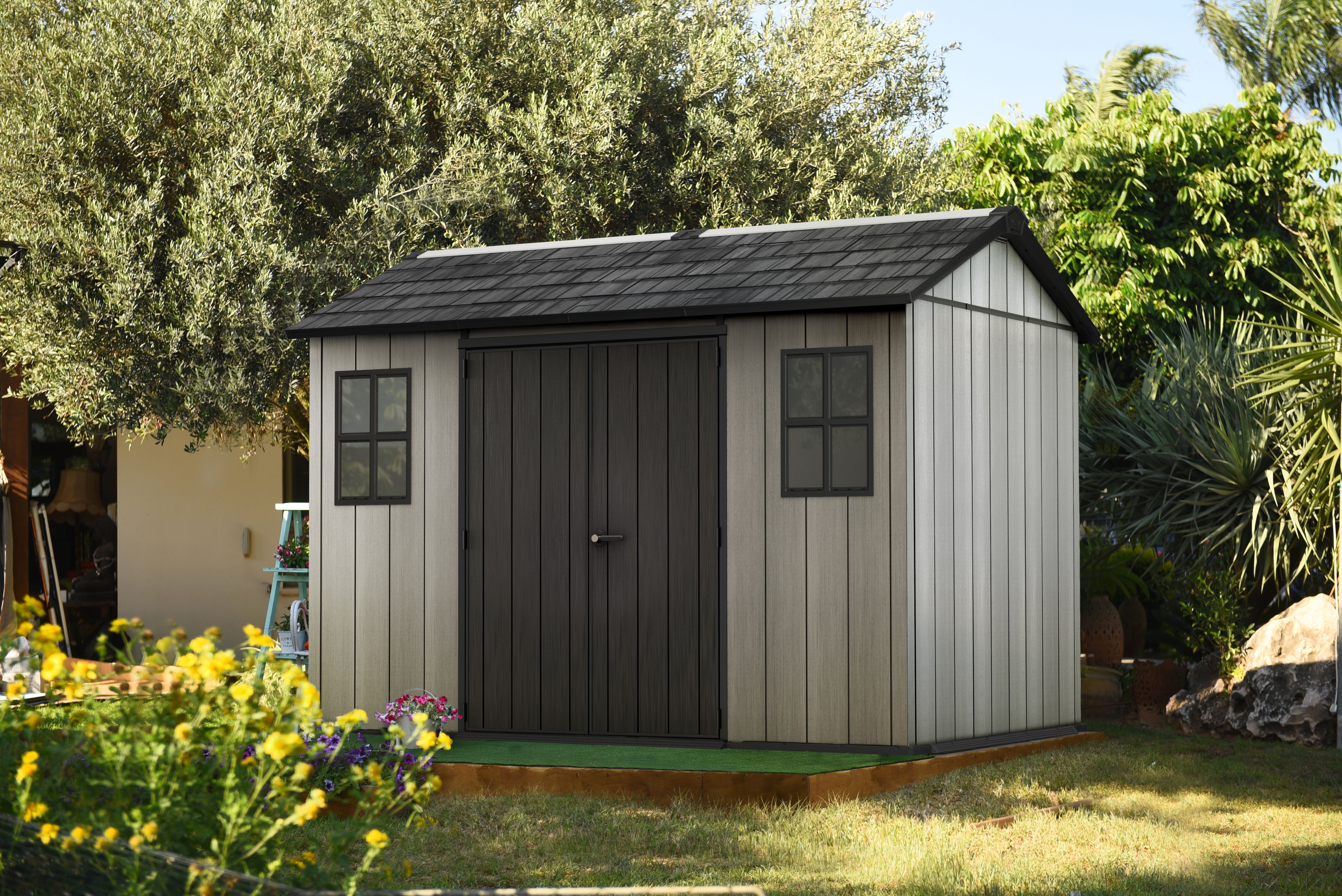Keter Oakland Grey Double Door Outdoor Apex Garden Storage Shed is an outdoor rustic chic-style garden shed with a wooden texture. The shed benefits a high ceiling to allow an adult to easily move around inside, specialist duotech walls that enables you to customise due to its paintable walls, wide double doors for easy access, a skylight and a Victorian-style window. Built to last, with a double wall, steel reinforced, weather-resistant construction, the Oakland 11 x 7.5ft shed also features a heavy-duty floor that is strong enough to support heavy items such as lawnmowers and a strong roof that can support snow loads of up to 100kg/sqm. This shed is easy to assemble with pre-cut tongue and groove panels and comes with a stainless steel locking system for additional security (lock not included).