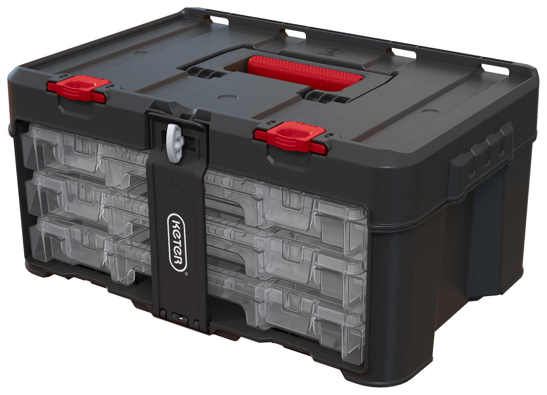 Keter Stack N' Roll 3 Set Organiser comes with 3 removable clear plastic fastenable containers and is fully compatible with the rest of the Stack N' Roll range, this Stack N' Roll 3-Set Organiser offers serious crafters and home DIYers alike a flexible way to organise, store and transport small-to-medium-sized items. Made from durable polypropylene resin for reliable everyday usage. Clear see-through plastic containers let you quickly identify contents. Whilst rigid click-shut plastic fasteners keep your items securely in place. The removable dividers let you customise your space to fit different sized items. A polycarbonate locking strip keeps drawers secured in the storage frame at all times. Fitted with a fold-down carry handle for easy portability. The Stack N' Roll System modular connectivity makes connecting other units a breeze.