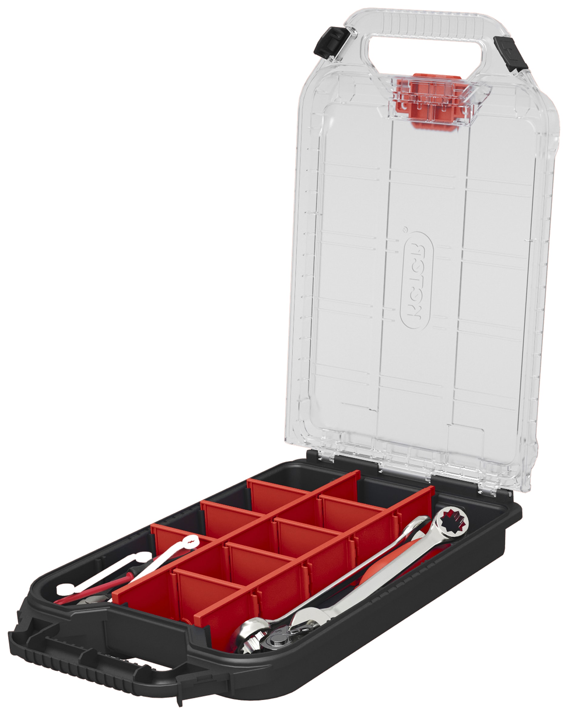 Keter Stack N' Roll Half Organiser is ideal if you need a flexible organisation solution but are short on space. Featuring a transparent polycarbonate lid which offers easy visibility of all your contents and is fully compatible with the rest of the Stack N' Roll range. Its 15 section adjustable dividers allow you to customise the compartment layout to your specific needs. The IP54 seal protects contents from dust, moisture and accidental contact with water, is ideal for outdoor use. Fitted with a comfortable soft rubber carry handle. Fitted with a large carrying handle for convenient portability. The Stack N' Roll System modular connectivity makes connecting other units a breeze.
