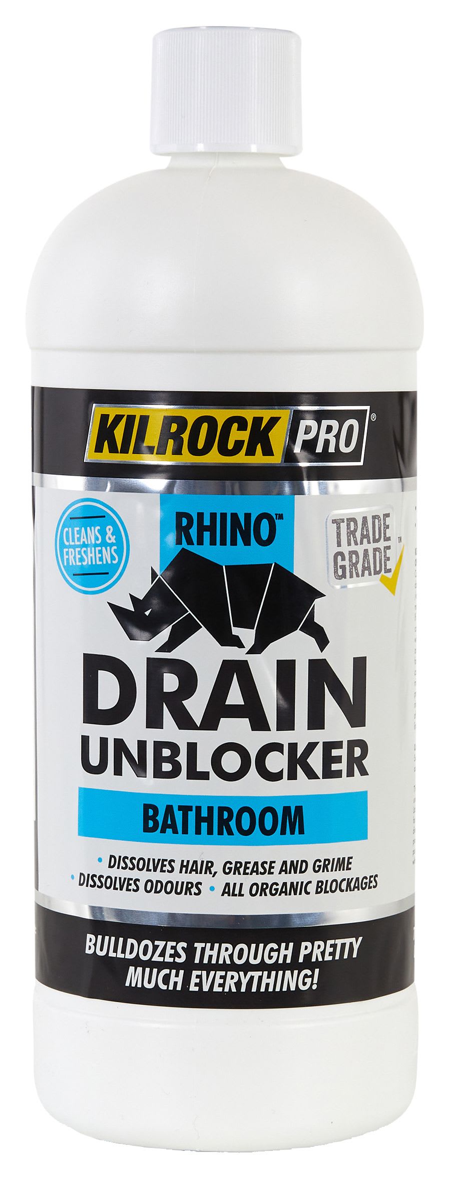 KilrockPRO Rhino Bathroom Drain Unblocker is a fast-acting trade strength formula that dissolves hair & grease blockages in minutes. It rapidly breaks down soap scum, hair & other organic deposits that cause slow-draining plugholes. Ideal for use in sinks, baths & shower drains.