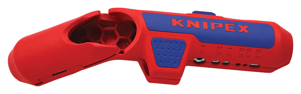The Knipex ErgoStrip® Universal Left Handed Stripping Tool is used for the fast and precise dismantling and stripping of all common round and damp-proof installation cables (e.g. NYM cable 3 x 1.5mm² up to 5 x 2.5mm²), data cable (e.g. twisted pair) and coax cable. The innovative ergonomic pistol grip is designed for easy cutting, stripping and longitudinal cutting of the sheath. The conical slimmed down tool ends give better access in confined areas and there is a stripping device for cross-sections 0.2, 0.3, 0.8, 1.5, 2.5 and 4mm². It offers simplified insertion of single wires for stripping using location ridges, easy insertion of coax and data cable thanks to spring opening aid.