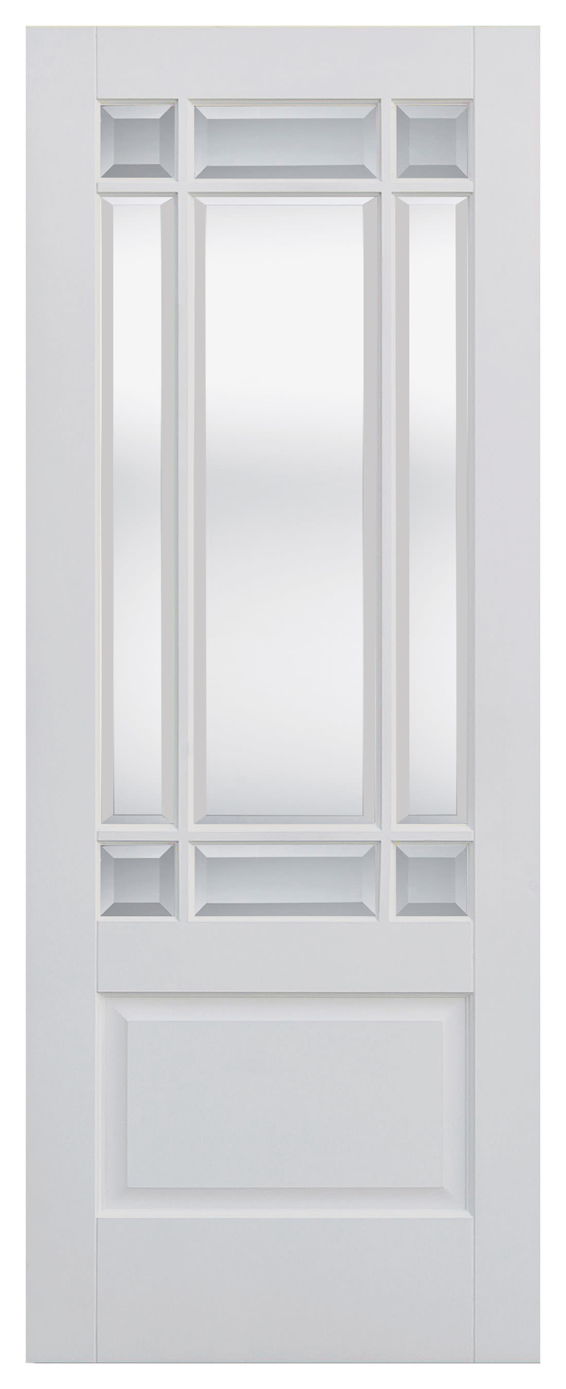 LPD Internal Downham 9 Lite Glazed Primed White Solid Core Door is a great option for use in both modern and traditional styling. The clear beveled glass panels are decorated with subtle white primed beading. Its white finish and raised shaped panel complement this design perfectly. Built with a solid core, it's a durable option perfect for adding character and style to any home.