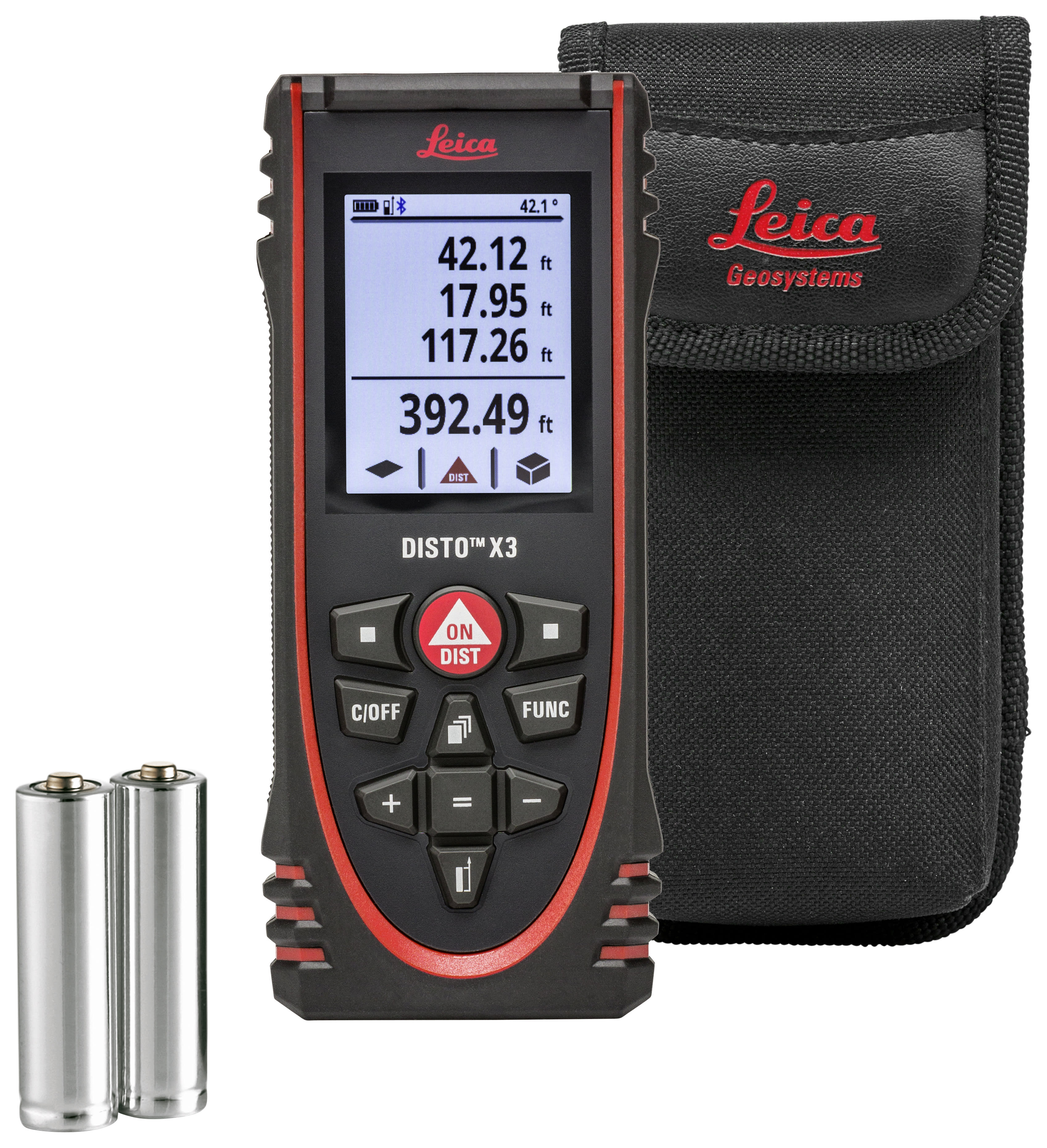 - Included in the box: Leica DISTO X3, carrying pouch, 2 x AA batteries, hand loop, quickstart guide, warranty card, safety manual, calibration certificate silver