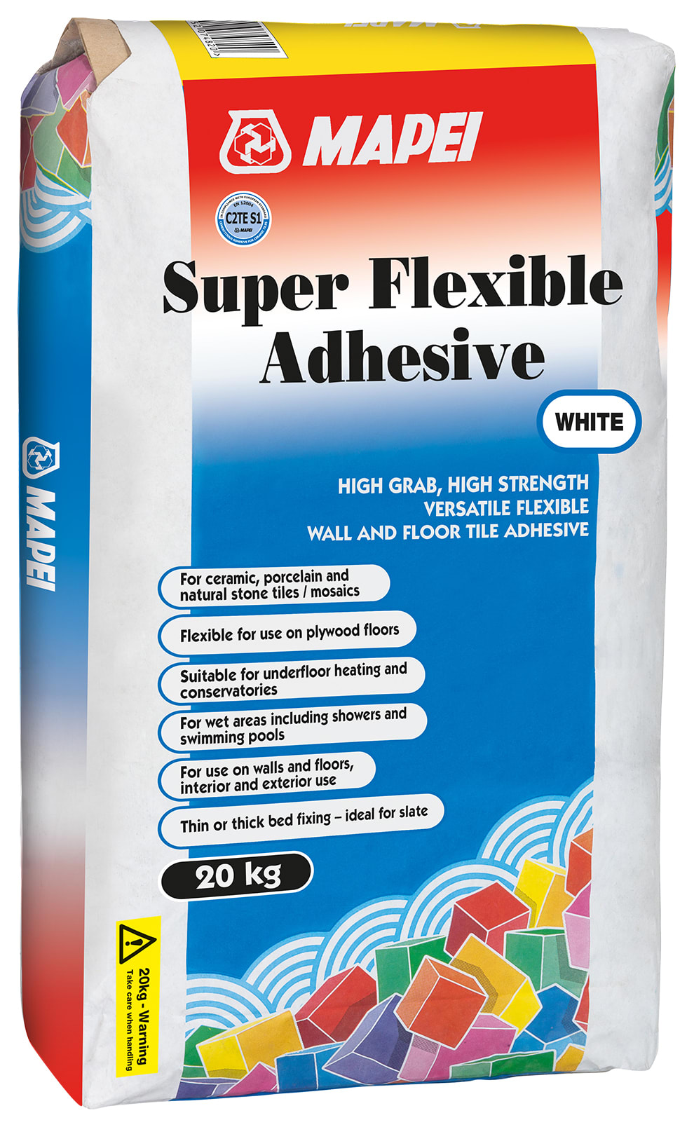 Mapei Super Flexible S1 Wall and Floor Tile Adhesive is a standard setting, cement based, high strength and flexible tile adhesive. For use with ceramic, porcelain, mosaics, quarries, brick slips and non moisture resistant natural stone tiles. Can be used with tiles up to 1200 x 1200mm in size and ideal for use in kitchens, bathrooms, showers, conservatories on balconies, patios, swimming pools and pool surrounds. Featuring a high initial grab to securely hold even large tiles in place while the adhesive cures, without the material slipping or moving. This adhesive is polymer-modified to provide increased flexibility and an ability to withstand temperatures up to 90 degrees Centigrade.