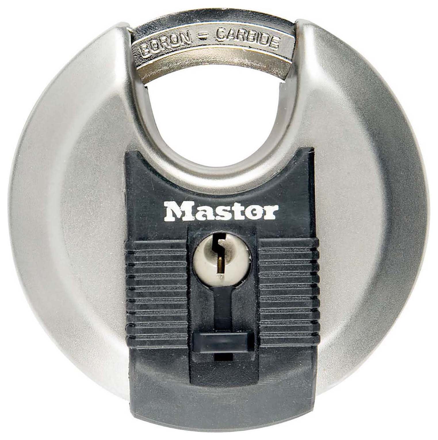 The Master Lock Excell Discus Padlock features a 70mm wide stainless steel body for maximum strength, reliability and corrosion resistance. The fully shrouded design minimizes shackle exposure and protects against bolt cutter attacks. The 10mm diameter octagonal shackle is 16mm long and made of Tough-Cut boron-carbide, 50% harder than hardened steel, offering maximum resistance to cutting and sawing. The 4-pin cylinder prevents picking and the dual locking ball bearings provide maximum resistance against prying and hammering. The covered keyway offers maximum weather protection, and reinforced body bumper protects against scratches. This padlock is perfect for self storage units, sheds, trailers, moving trucks, vans and more. The limited lifetime warranty provides peace of mind from a brand you can trust.
