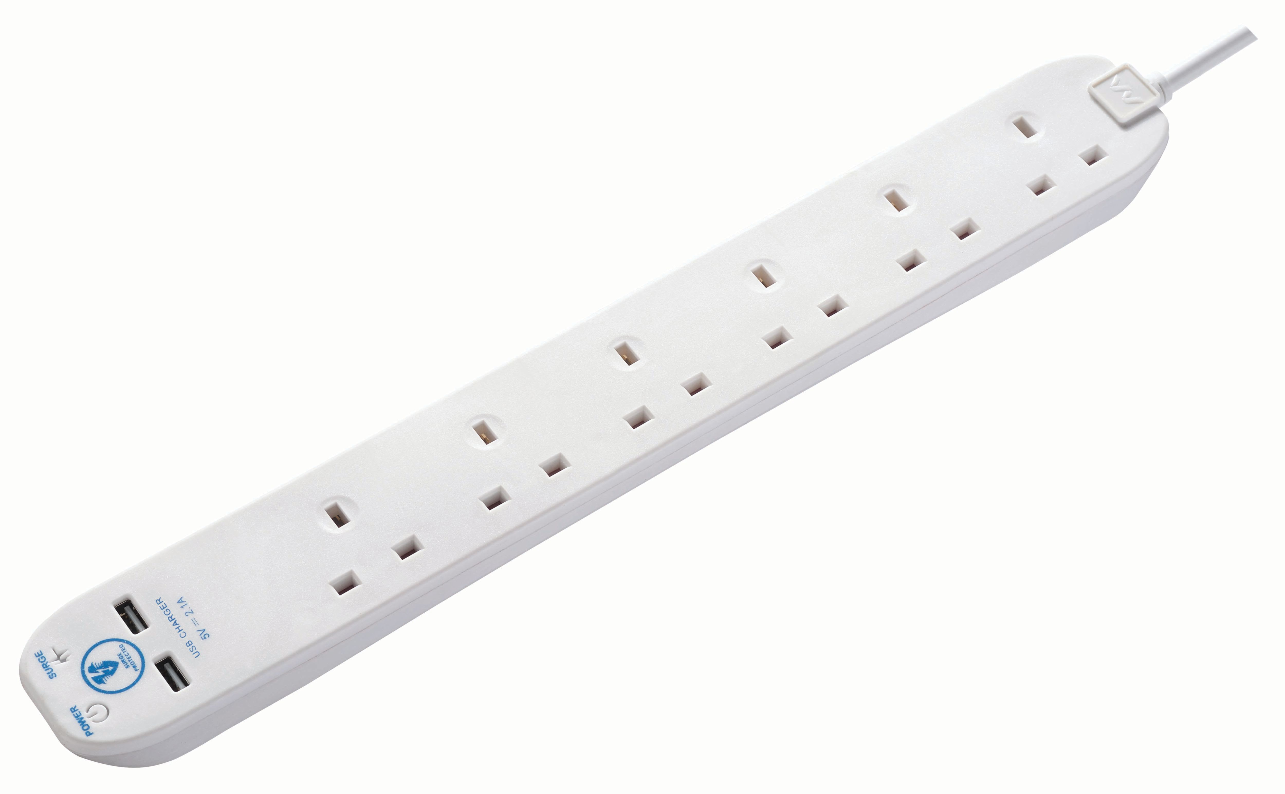 Masterplug 13A 6 Socket White Extension Lead with Surge Protection & USB - 2m
