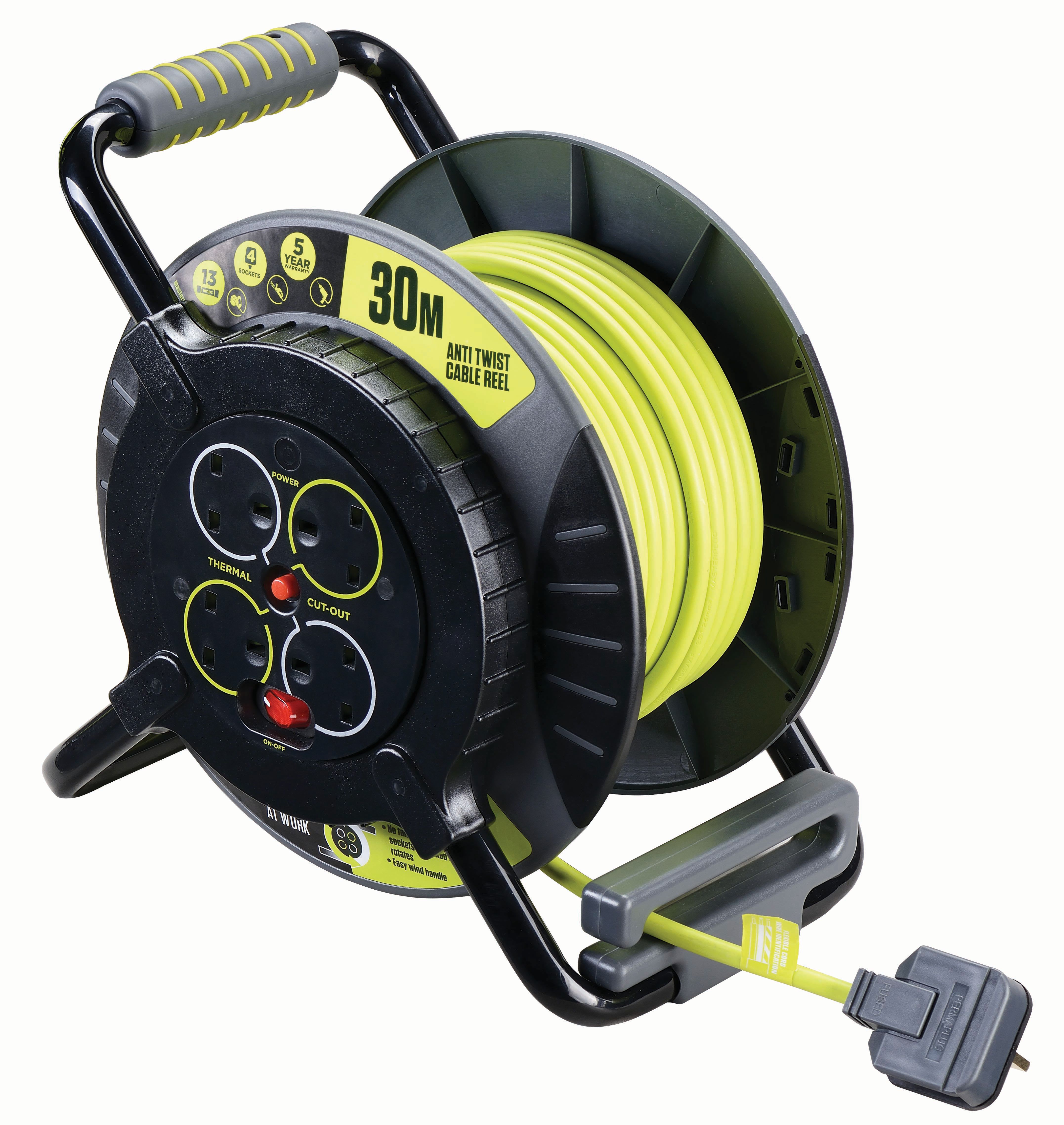 The Masterplug 13A Pro-XT Anti-Twist Fixed Socket Open Reel Cable is designed to accommodate multiple devices and tools simultaneously. With four power outlets, it provides versatility and convenience for both professional workspaces and DIY projects. Designed to prevent cable tangling and twisting, the fixed sockets ensure that your work environment remains organised and hazard-free. This feature is especially useful for busy workspaces and construction sites. Extensive 30m cable length, it's perfect for larger workspaces, construction sites, and outdoor projects.
