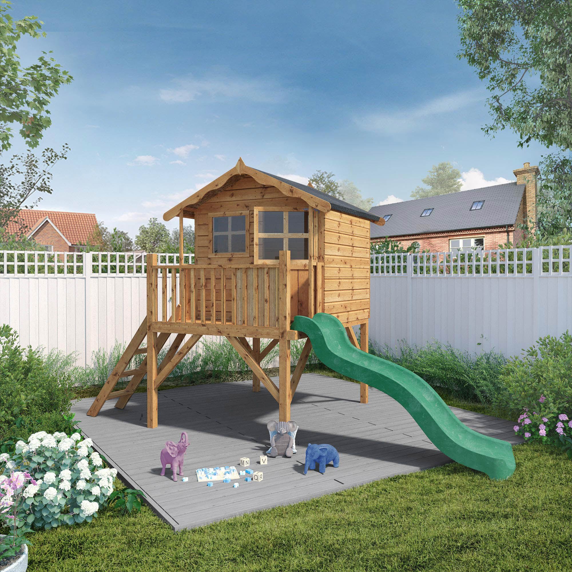 The Mercia Wooden Poppy Playhouse including tower and slide is constructed from 12mm shiplap cladding, styrene glazing and sheet board as floor and roof. Built with safety in mind, rounded framing helps private splinters, and all our playhouses are EN71 certified and UKCA Marked, including use features as a finger gap to prevent trapped fingers and plenty of air holes for ventilation.