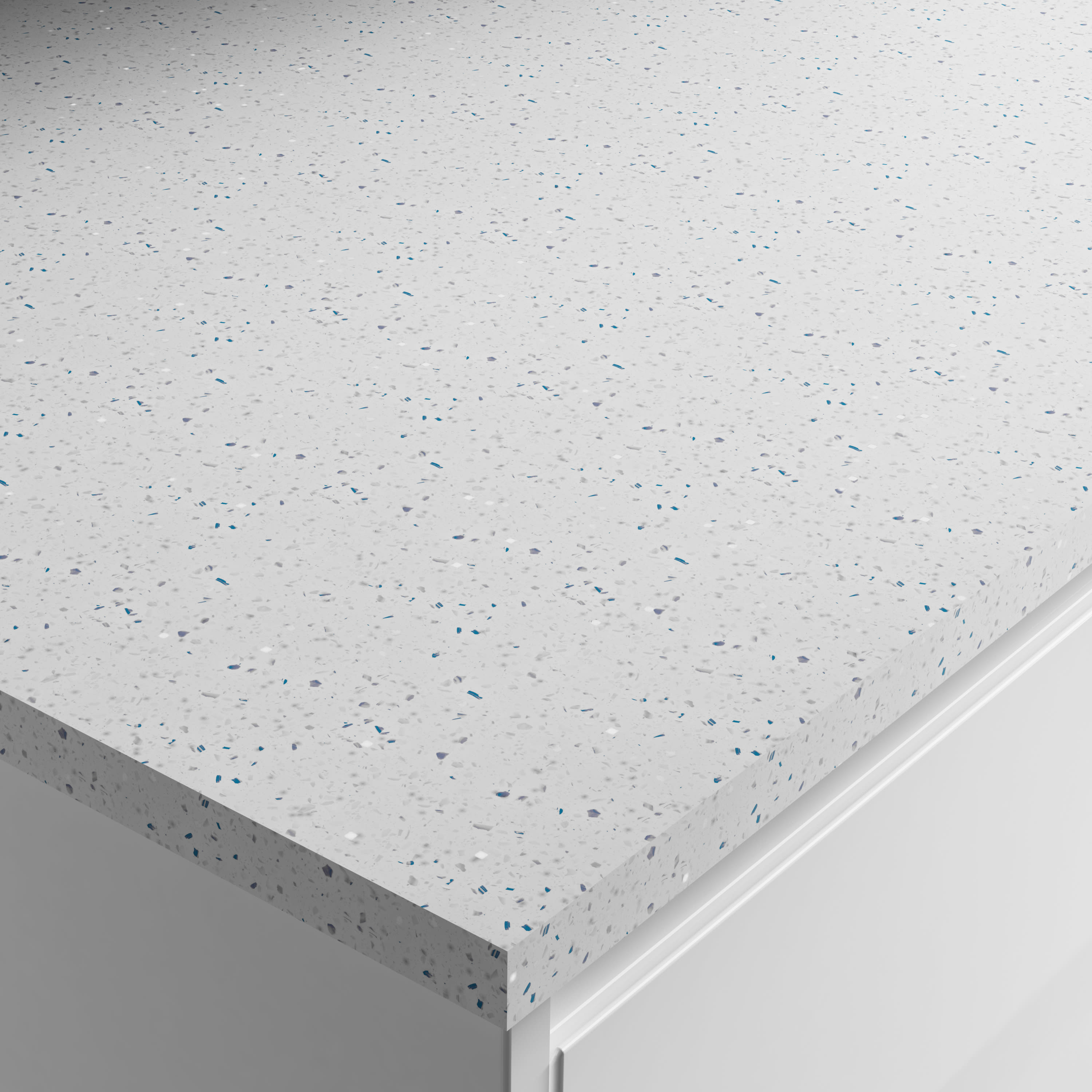 Enhance your kitchen with our stylish and versatile breakfast bar, thoughtfully designed to combine elegance with practicality. A soft and subtle choice, it seamlessly integrates into any space, offering both a sophisticated look and everyday functionality. With a cool-white background, Ice Blue uses dark blue flecks combined with crystal-like particulates to create a distinctive décor.