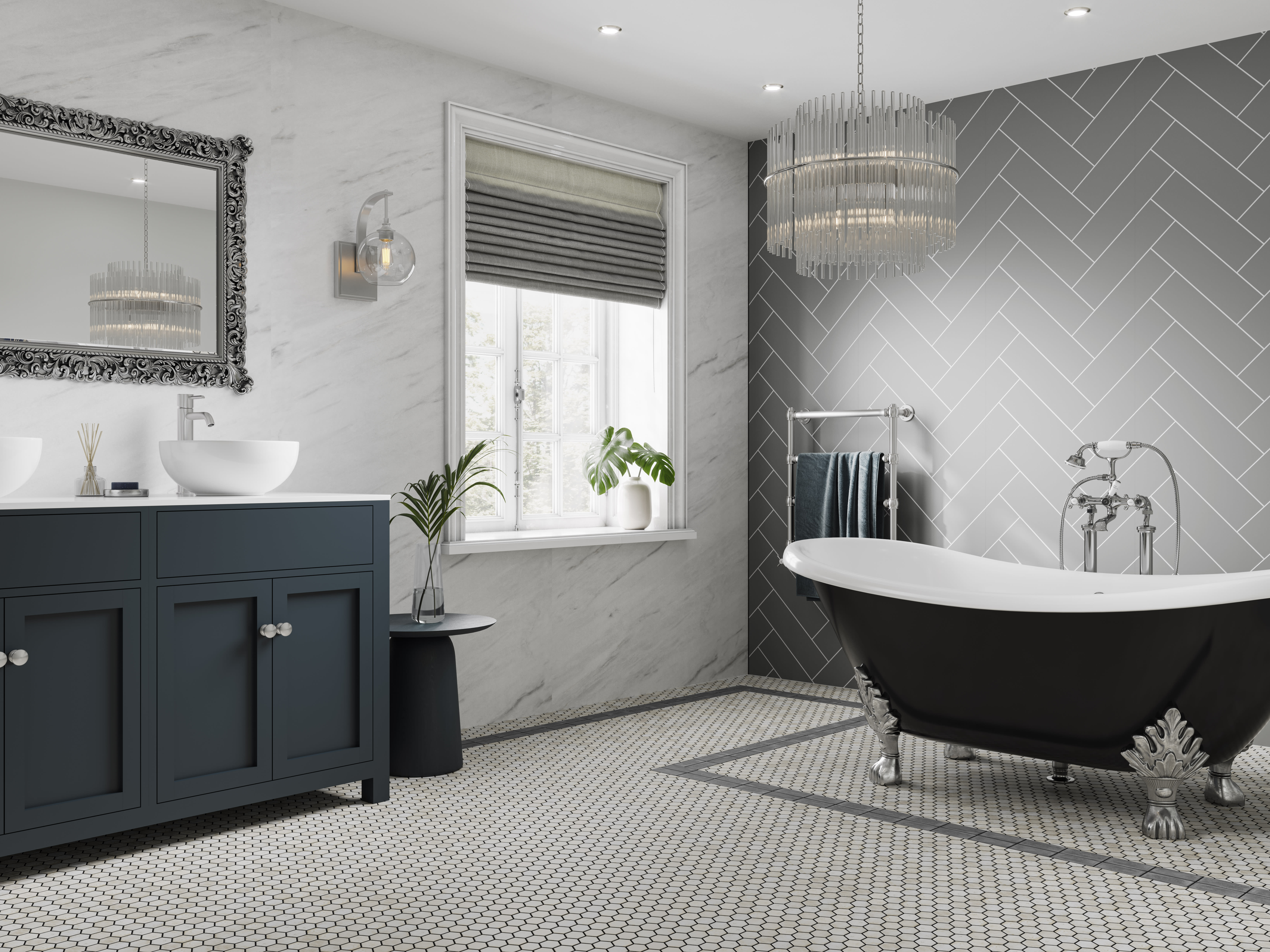 The tile collection by Multipanel offers a cost effective and functional solution for transforming your bathroom without the hassle of grout. Creating a stunning bathroom with tile effect wall panels that are easy to clean and maintain. Multipanel is quick, easy to fit and fully waterproof with an exterior grade MDF core and hydrolock tongue and groove edges. The herringbone dust grey wall panel offers a strong neutral palette, creating a seamless, elegent bathroom look.