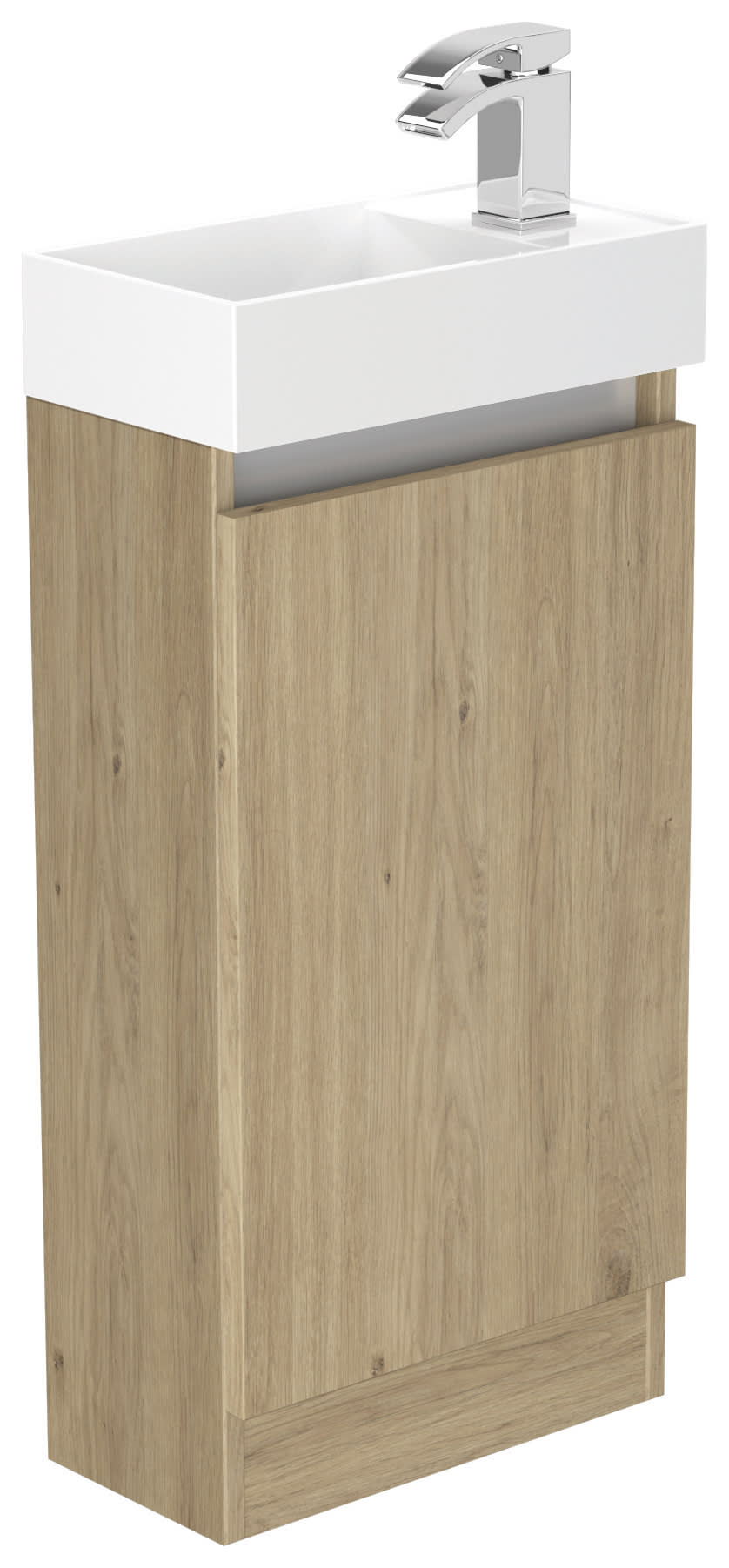 Discover the versatility and style of our compact single door floor standing basin unit, designed specifically for use in cloakrooms or where space is a premium. Its contemporary design, finished in a sleek Natural Oak, adds a touch of elegance to any small bathroom. The clever reversible feature allows the doors and basin to be adjusted to fit either left or right-handed orientation, providing flexibility in installation. Experience the convenience of the soft-close door, ensuring a whisper-quiet closure every time. This unit is supplied with a ceramic basin, combining functionality with a touch of sophistication. Crafted with meticulous attention to detail in the UK, this exceptional basin unit is proudly made and delivered directly by the manufacturer within a swift 3-day timeframe.