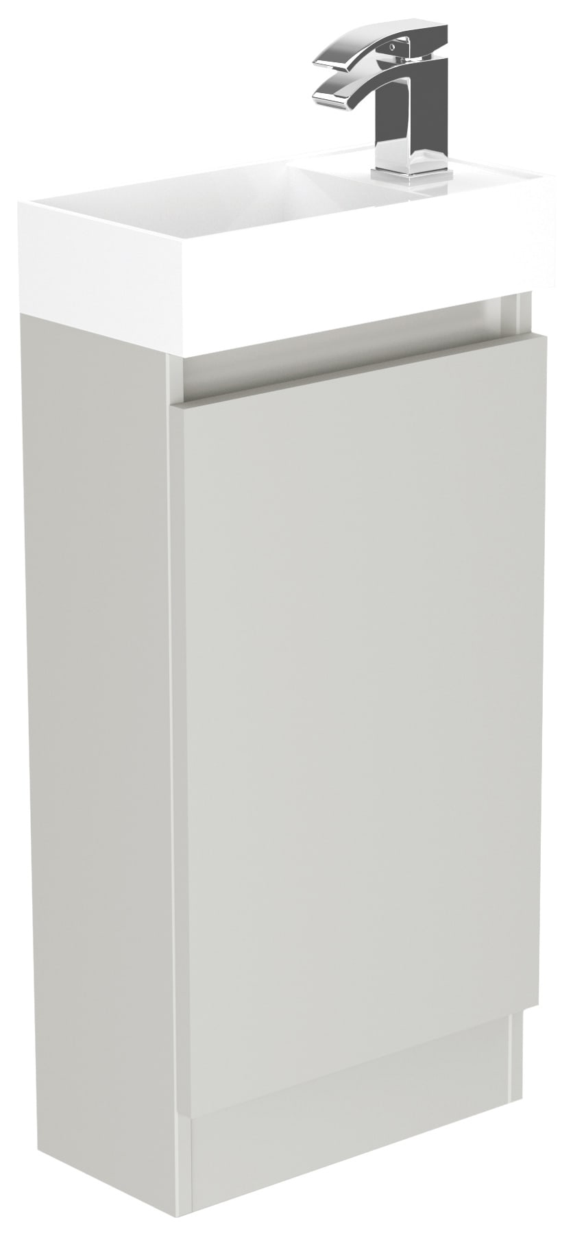 Discover the versatility and style of our compact single door floor standing basin unit, designed specifically for use in cloakrooms or where space is a premium. Its contemporary design, finished in a sleek Pearl Grey, adds a touch of elegance to any small bathroom. The clever reversible feature allows the doors and basin to be adjusted to fit either left or right-handed orientation, providing flexibility in installation. Experience the convenience of the soft-close door, ensuring a whisper-quiet closure every time. This unit is supplied with a ceramic basin, combining functionality with a touch of sophistication. Crafted with meticulous attention to detail in the UK, this exceptional basin unit is proudly made and delivered directly by the manufacturer within a swift 3-day timeframe.