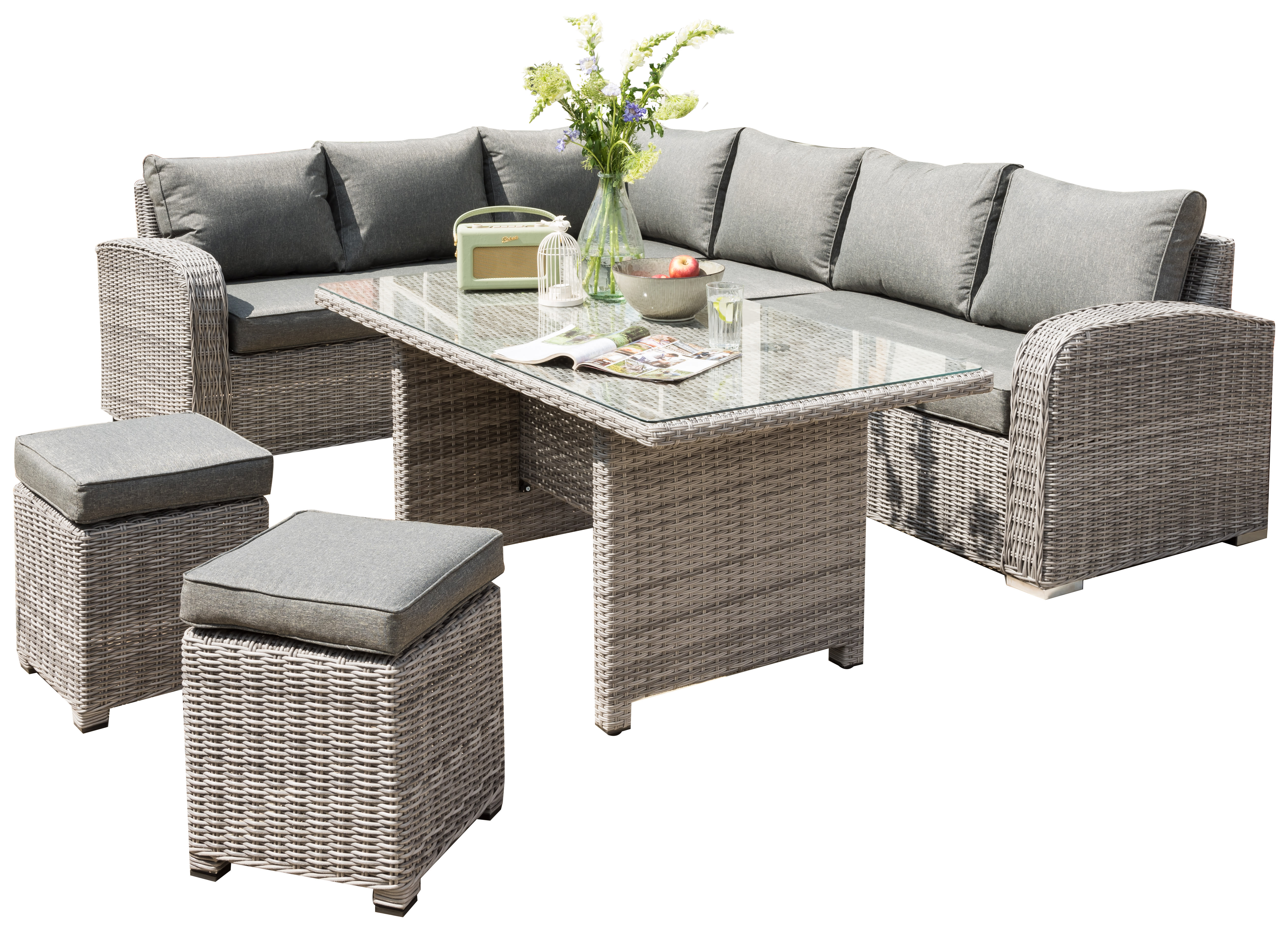 The Longbeach Corner Set will bring the comfort of indoors to your garden or patio & comes in a fashionable, double half round, textured grey resin weave which is hand woven onto an aluminium frame. The modular chairs come with sumptuous soft-feel, polyester seat & back cushions in co-ordinating grey & the casual high dining table comes with a glass top for easy cleaning.