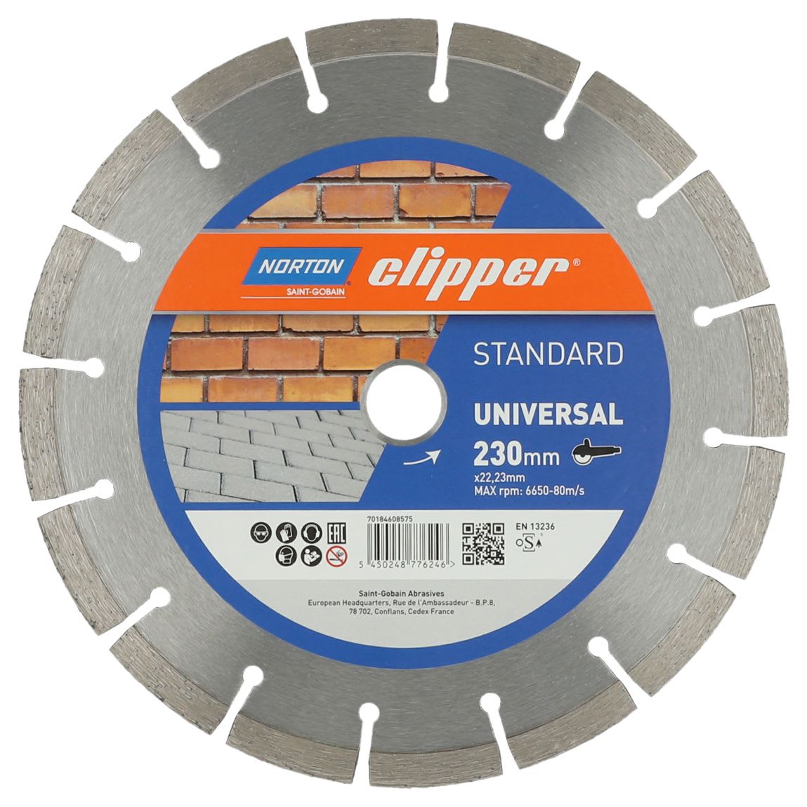 The Norton Clipper 230mm Universal Turbo Blade is for universal building materials such as brick, paving stones, building blocks. The bore size is a standard 22.23mm and the diamond height is 10mm, this blade can be used in either wet or dry applications. For use with angle grinders.