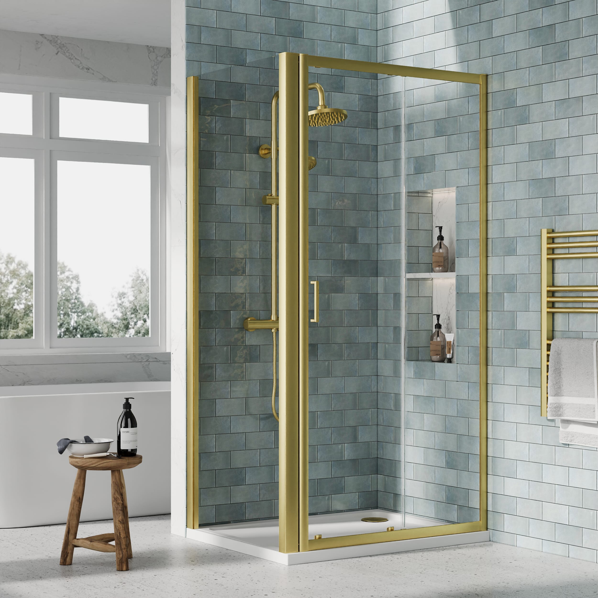 Nuie Brushed Brass Sliding Door Side Panel Tray & Waste Shower Enclosure Package - 1000 x 760mm