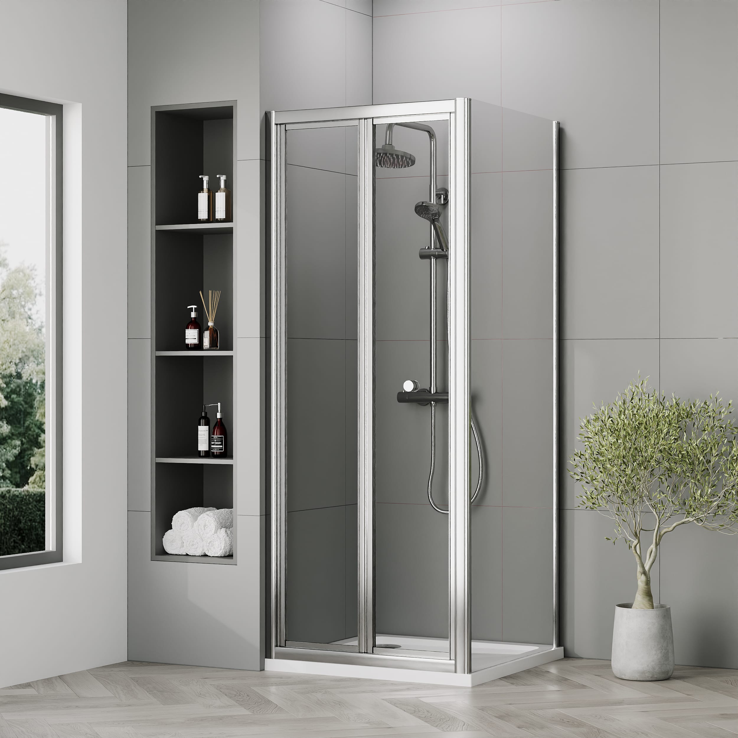 Nuie Chrome Bi-Fold Door Side Panel Tray & Waste Shower Enclosure Package - 800 x 800mm