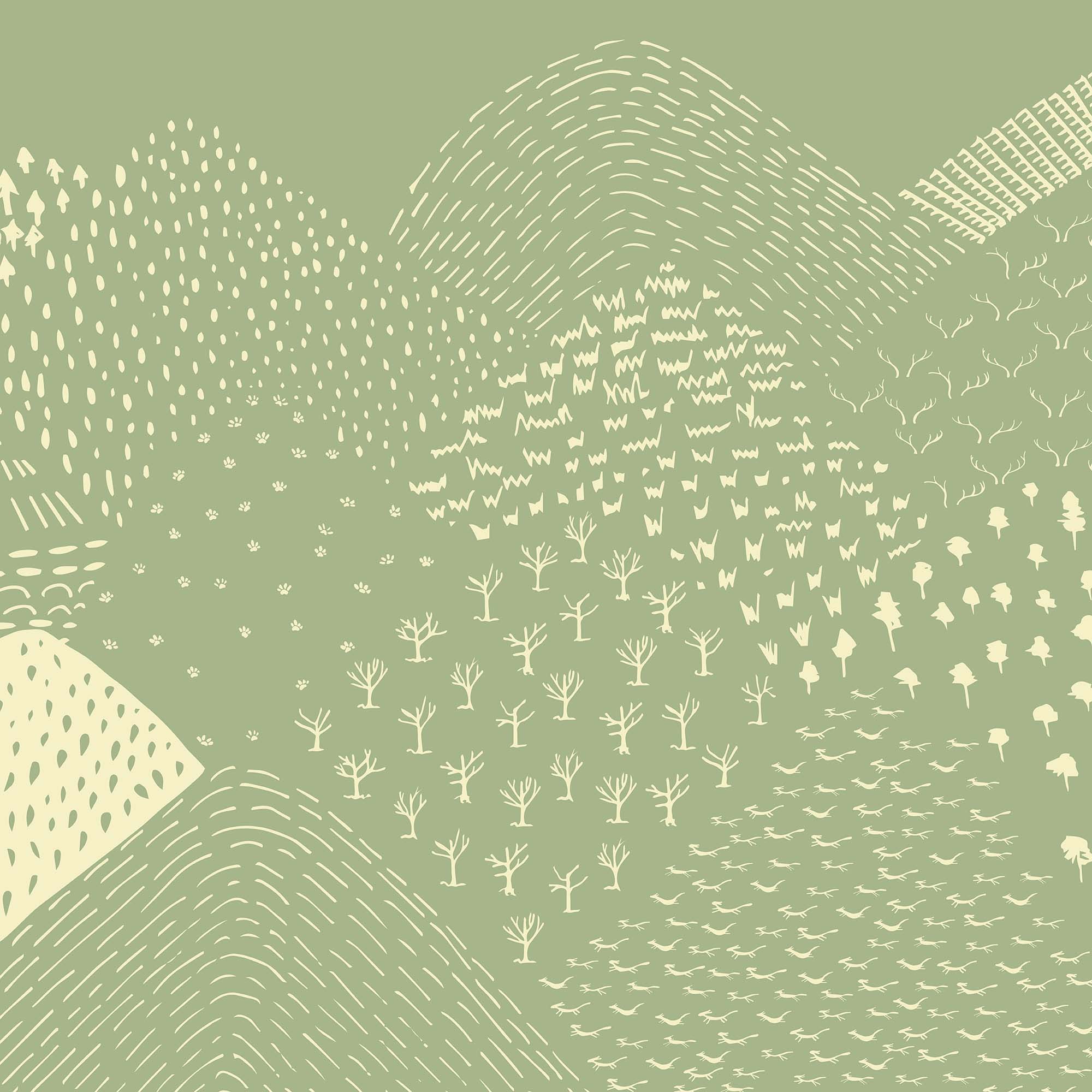 The Abstract Fields Wall Mural from Origin Murals features an abstract depiction of fields and forests. Rolling hills and dotted illustrative trees add a charming touch to this calming mural.