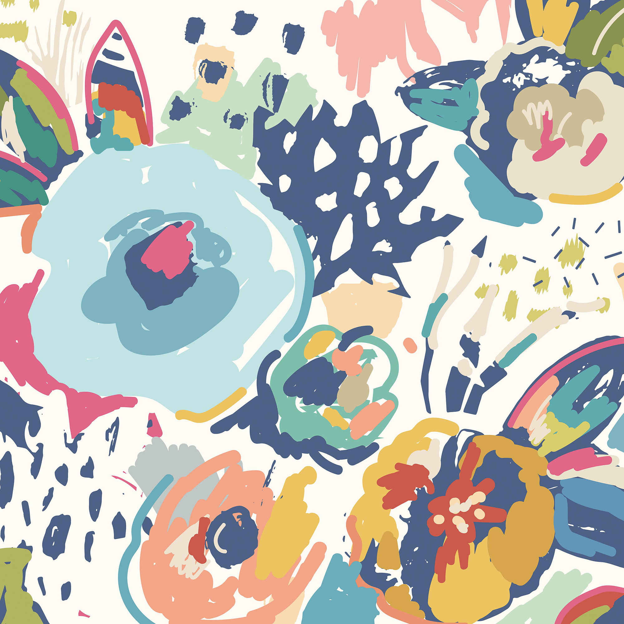 Organic painterly blooms and markings combine in this abstract depiction of flowers and leaves. Decorative dots and dashes dance around the design whilst flower heads bloom confidently.