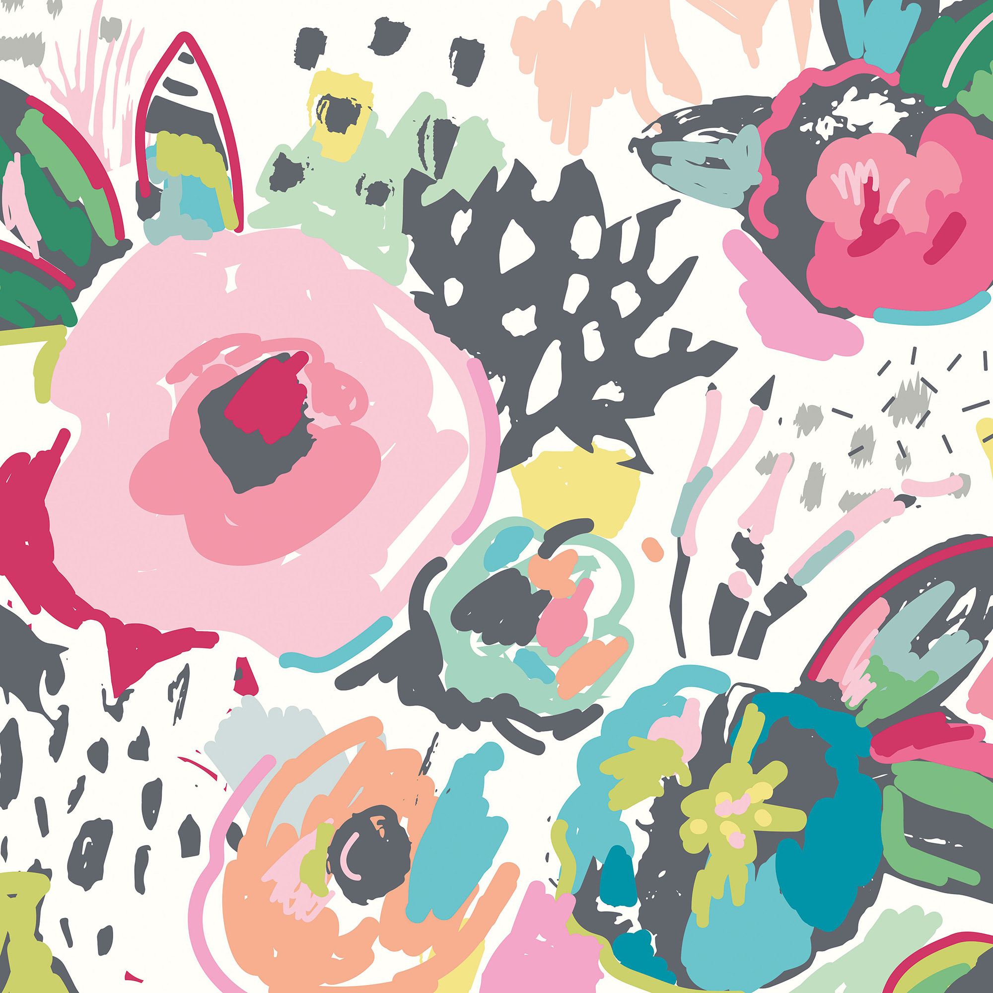 Organic painterly blooms and markings combine in this abstract depiction of flowers and leaves. Decorative dots and dashes dance around the design whilst flower heads bloom confidently.