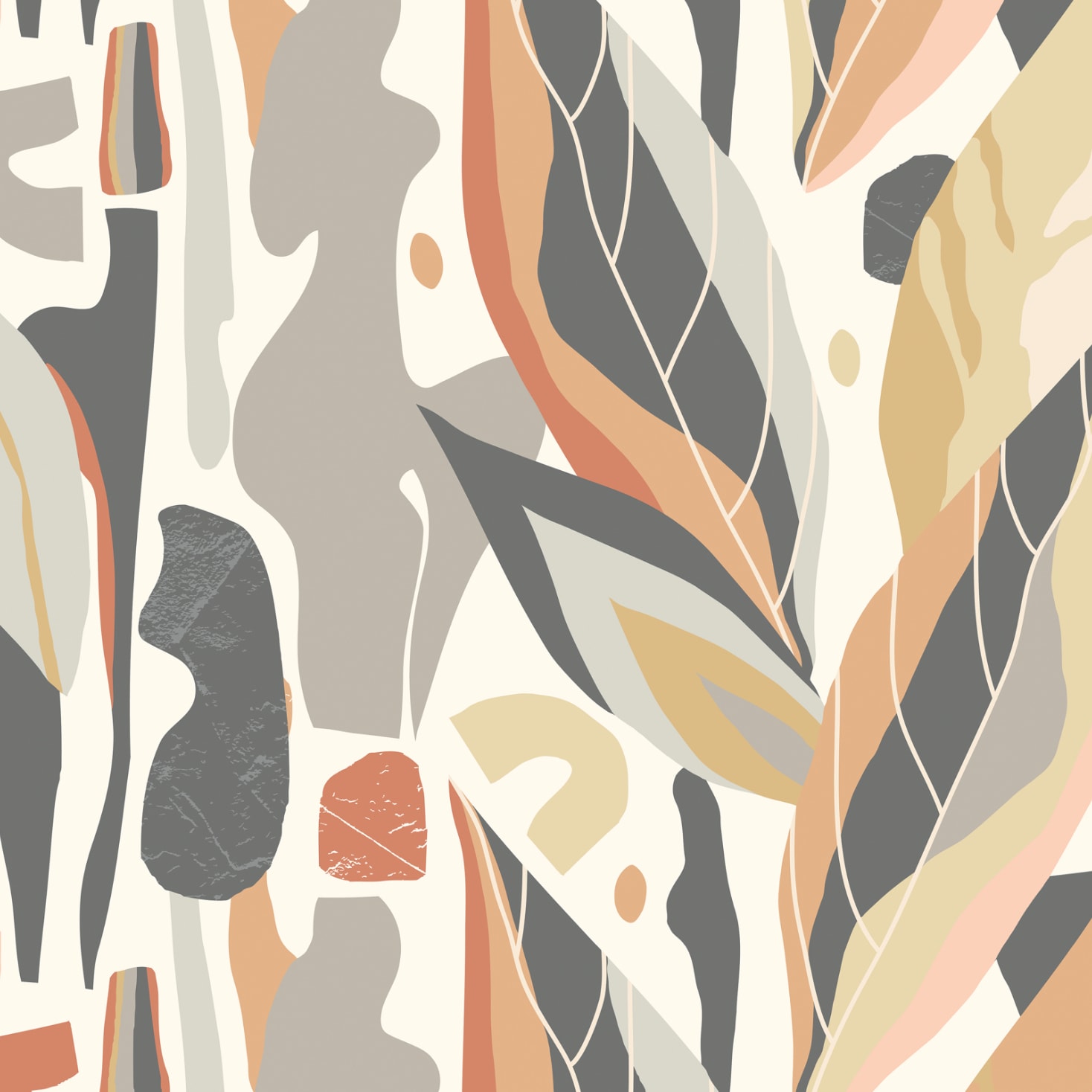 This contemporary wall mural features an assortment of abstract leaf shapes and sculptural representations of the human form.