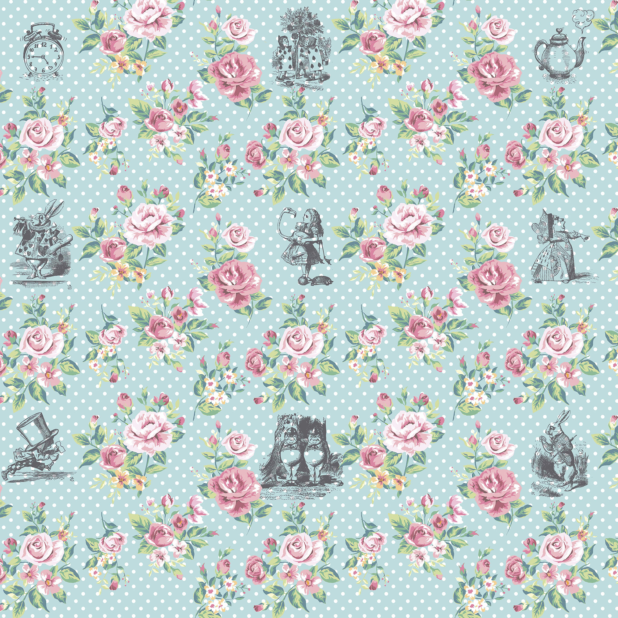 The Alice In Wonderland English Rose Print Wall Mural from Origin Murals is classicly pretty and simplistic. This design turns a quintessentially English rose design into something more contemporary and inspiring. A retro polka dot backdrop hosts Alice in Wonderland inspired illustrations peeking through charming florals.