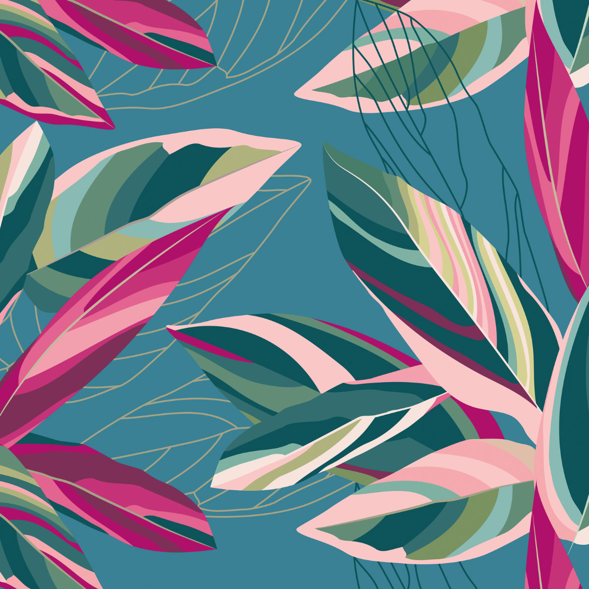 This colourful botanical wall mural features bold calathea leaves in an intriguing layered effect. Linear leaf shapes intertwine around the main leaves to add more depth to the design.